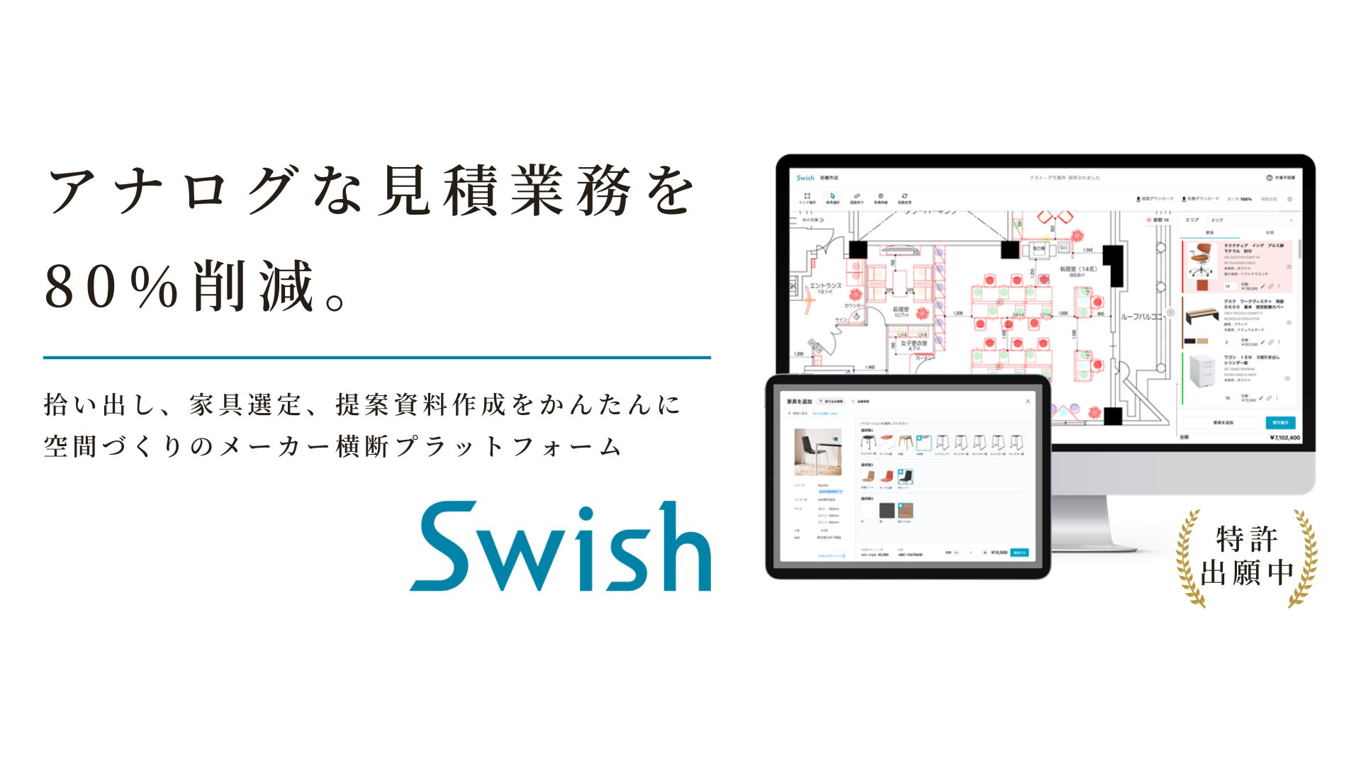 株式会社Swishは、「空間づくりの常識をアップデートする。」をミッションに掲げ、大手オフィス家具メーカーのコクヨ株式会社出身の代表が2021年7月に設立した会社です。様々な環境変化によって需要が高まるオフィスの空間づくりにおいて、見積業務のアナログさによって引き起こされる納品ミスや長時間労働、また受注機会の損失をなくす業務効率化サービス「Swish」を開発・提供しています。