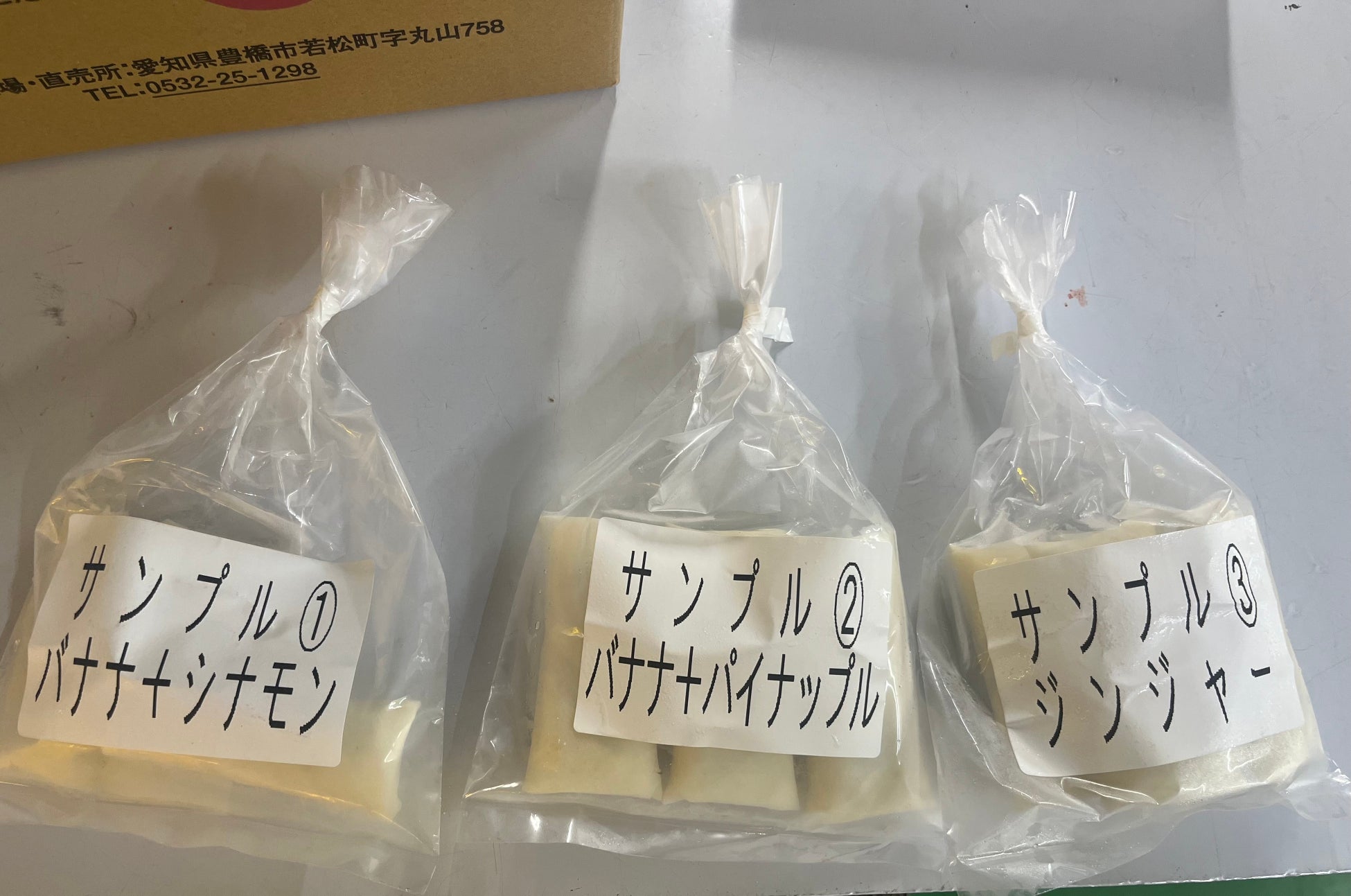 まずスタッフ自身が、様々な原料を使用した3種類のブラックサンダー春巻きを試作し、有楽製菓株式会社の河合辰信社長にご試食いただきました。その際、バナナとシナモンの相性を高く評価いただくとともに、