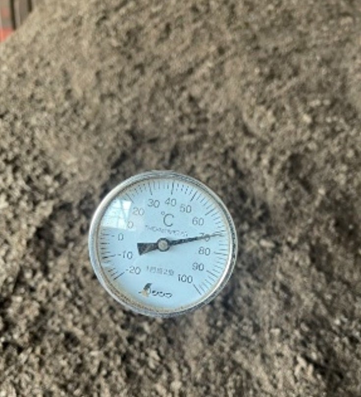 2022年2月、瑛心キャトルフィールドがERSを導入して初めて迎えた冬、外気温はマイナス20℃に達しました。そのような環境下、JETが処理後の発酵乾燥物を温度計測したところ、約70℃の発酵熱を維持していることが確認できました。