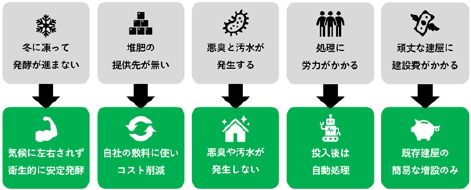 瑛心キャトルフィールド株式会社(本社:北海道河東郡、代表者:高橋竜)は、飼養する肉牛約700頭の糞尿処理のために、一般的な攪拌装置とエアレーション装置を用いた堆肥舎の導入を検討していました。しかしながら、堆肥舎内でも冬季には凍結により発酵が進まないこと、悪臭と汚水が発生すること、堆肥の提供先が無いことに懸念がありました。