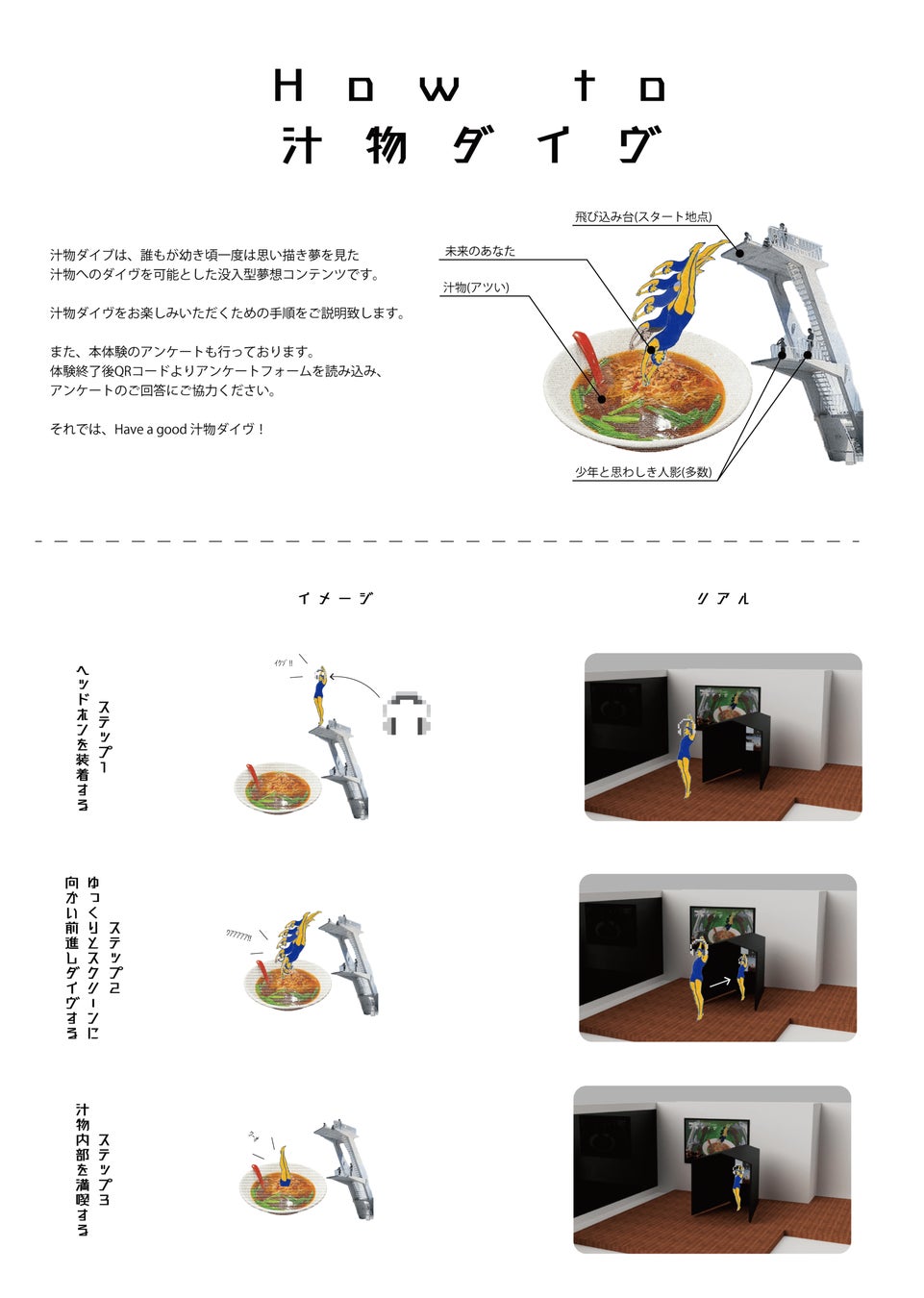 “汁物ダイヴ”は誰もが一度は思い描く、汁物へのダイヴを擬似的に体感することを可能にしました。当たり障りのない日常に潜む非日常へ身体的没入感を持ってアクセスするとき、コンテンツと鑑賞者のテンポは同調するという仮設を元に制作したスタディとなります。