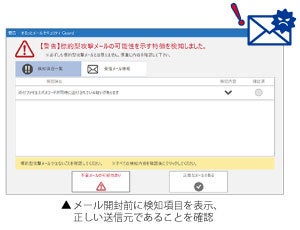 メール受信時は、標的型攻撃メールの特徴が含まれないかを自動で判断。送信元の改ざんの恐れやリンク先URLの改ざんを検知し、疑わしいメールには警告を表示します。