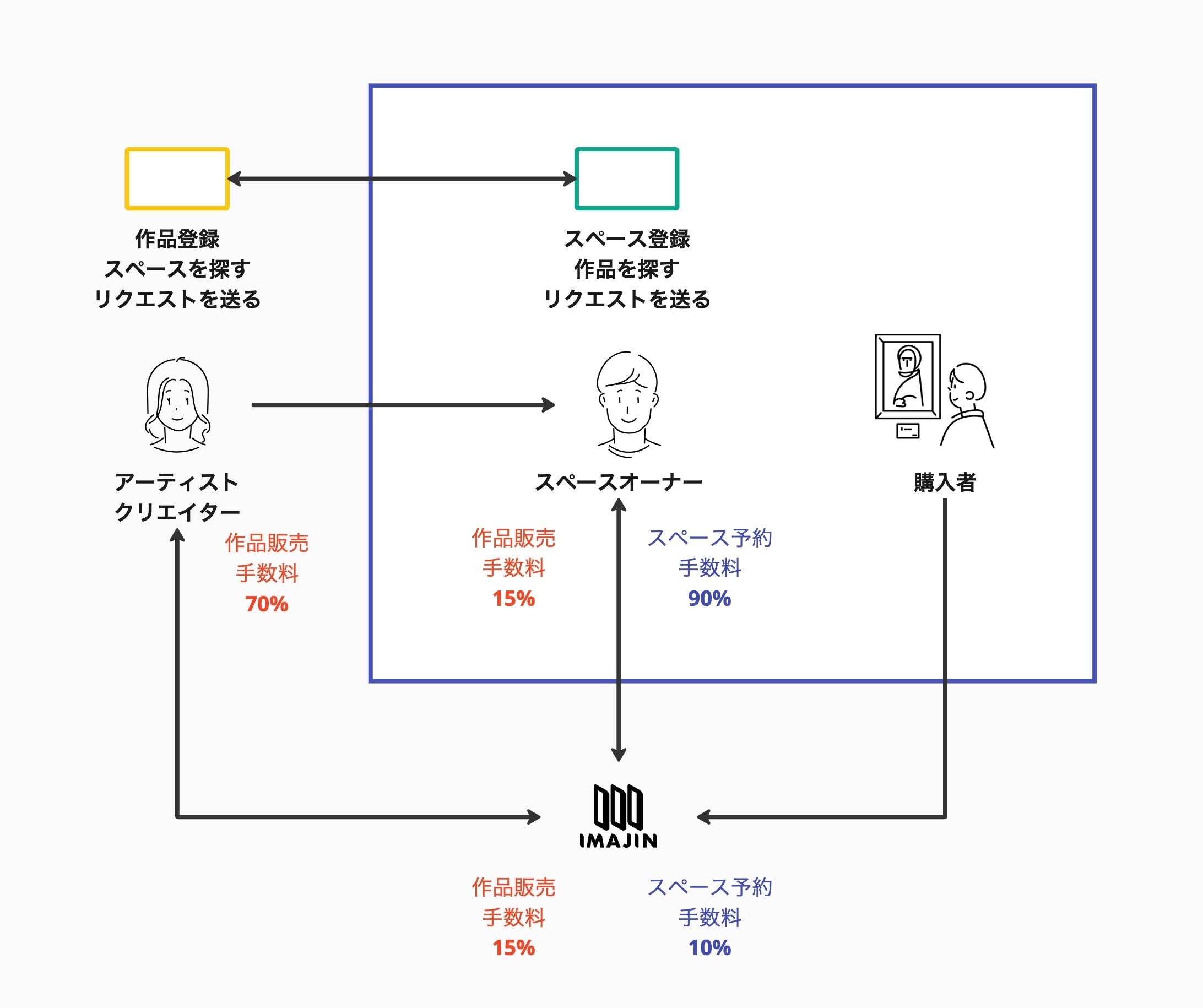 アーティストはIMAJIN SPACE(イマジンスペース)内のスペースを予約し、オーナーから承認を得ることで、その予約期間中作品を展示・販売することができます。