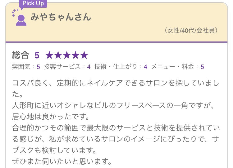 小学校教諭を経てネイリストに転職したオーナー久賀田有紀が2013年銀座で開業したネイルサロン。