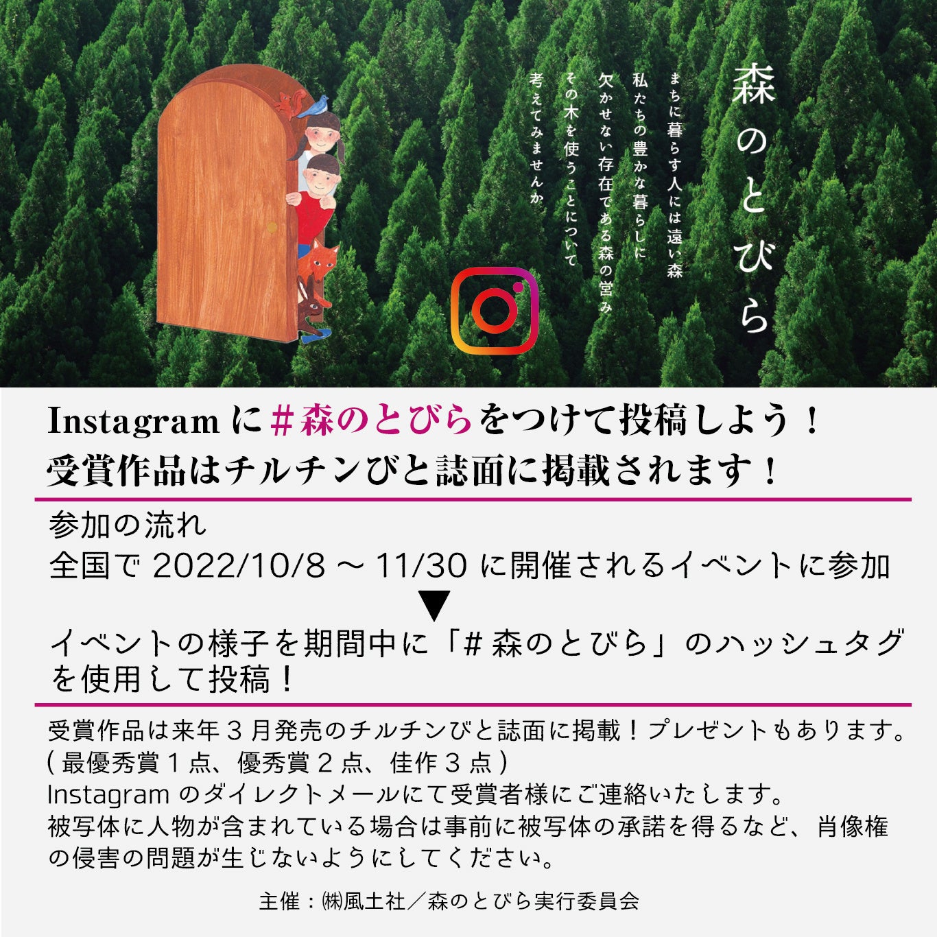 イベントに参加→「#森のとびら」をつけてInstagramに投稿すると、受賞作品は、『チルチンびと』に掲載!