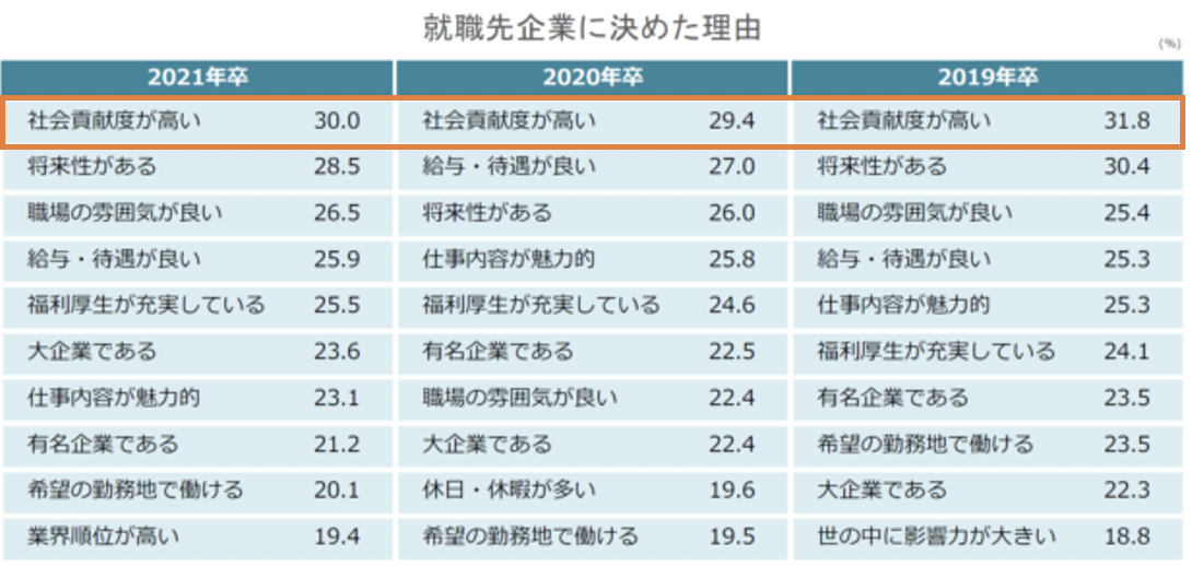 その理由としては、現代の一般消費者は企業のサステナビリティを注視しており、学生の就活において企業選びの基準に「社会貢献活動をしている」という項目が1位であることやサステナビリティを打ち出した広告施策により「ブランド共感者が増え、売り上げが向上した」事例があるようにサステナブルな取り組みを一般消費者へ分かりやすく発信していく必要があるからです。