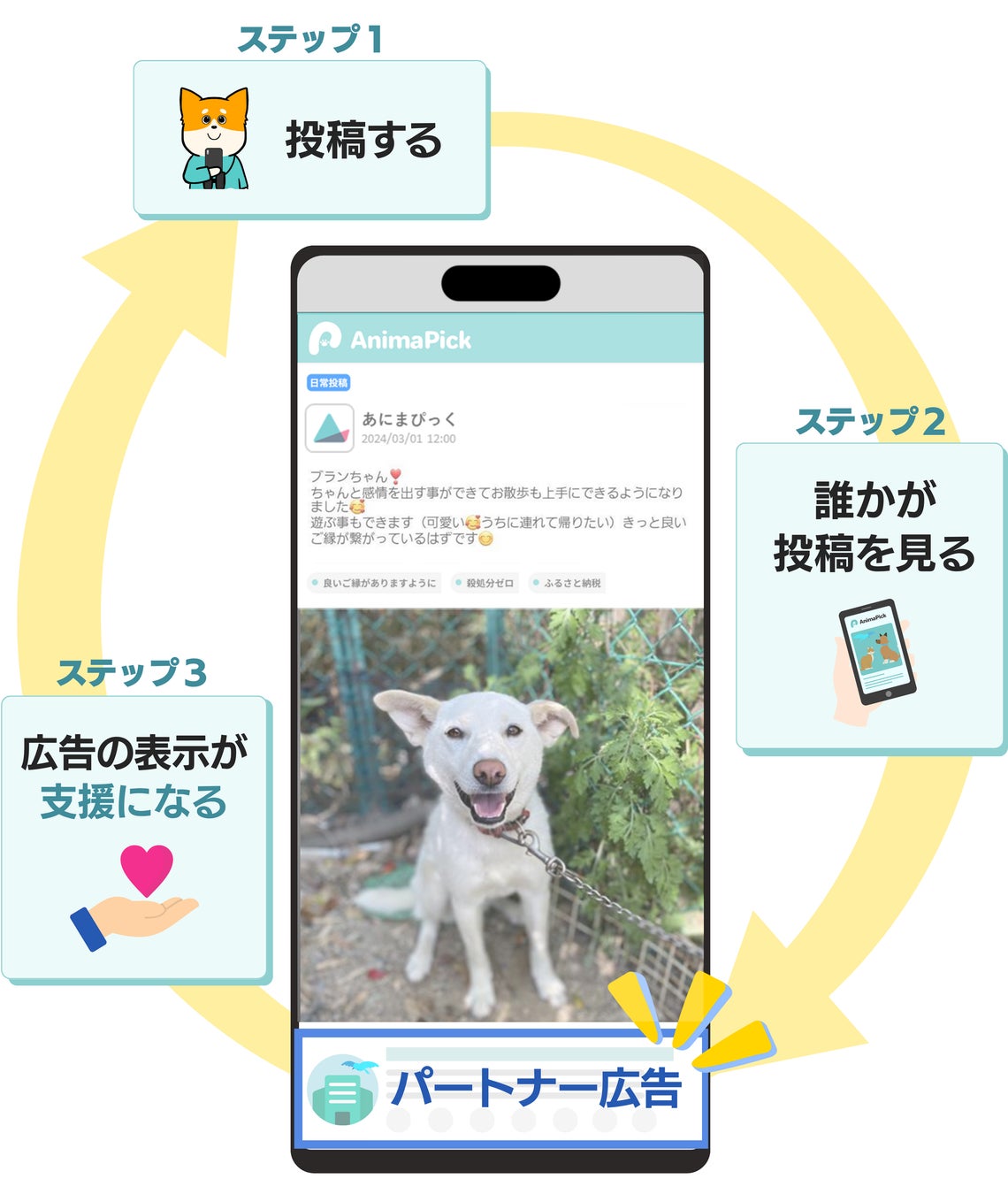 企業・保護団体・ユーザーがそれぞれの立場から保護動物を支え、想いと支援が自然に循環していく——それがAnimaPickの特徴です。
