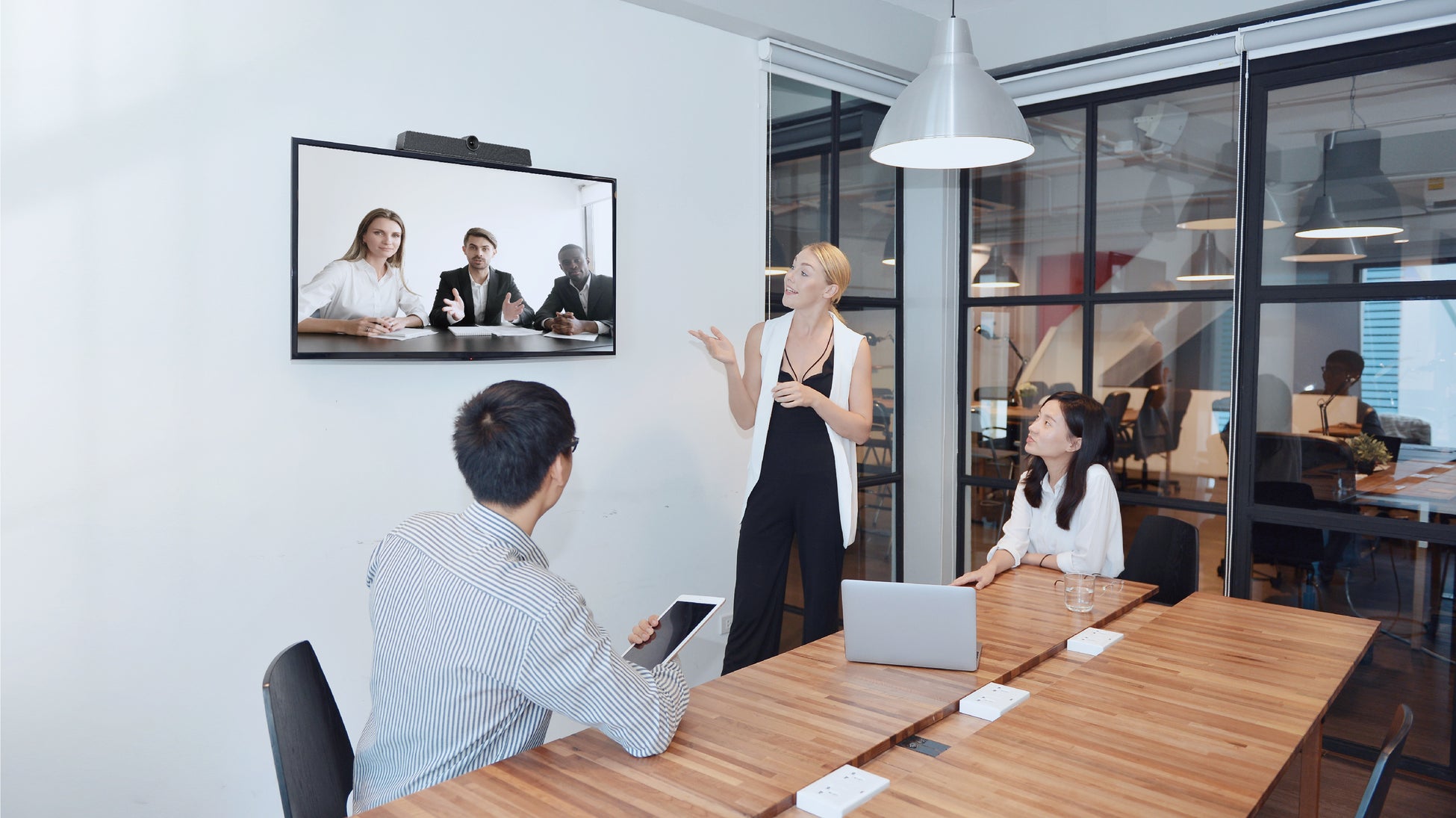 3つのレンズにより、会議室内の様子を撮影でき、本体上部のボタンを押すだけでビデオレイアウトを簡単に切り替えられます。パノラマ画像はもちろん、参加者のクローズアップや、ホワイトボードと発表者にフォーカスした画像も撮影できます。発表者の追尾も可能です。
