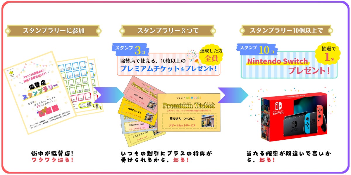 「協賛店スタンプラリー」では、55店舗のうち3店舗をまわると、さらにお得なサービス券「プレミアムチケット」をGETできます。今まで行ったことのないお店に足を運ぶきっかけとなり、「街をめぐる」を実現します。