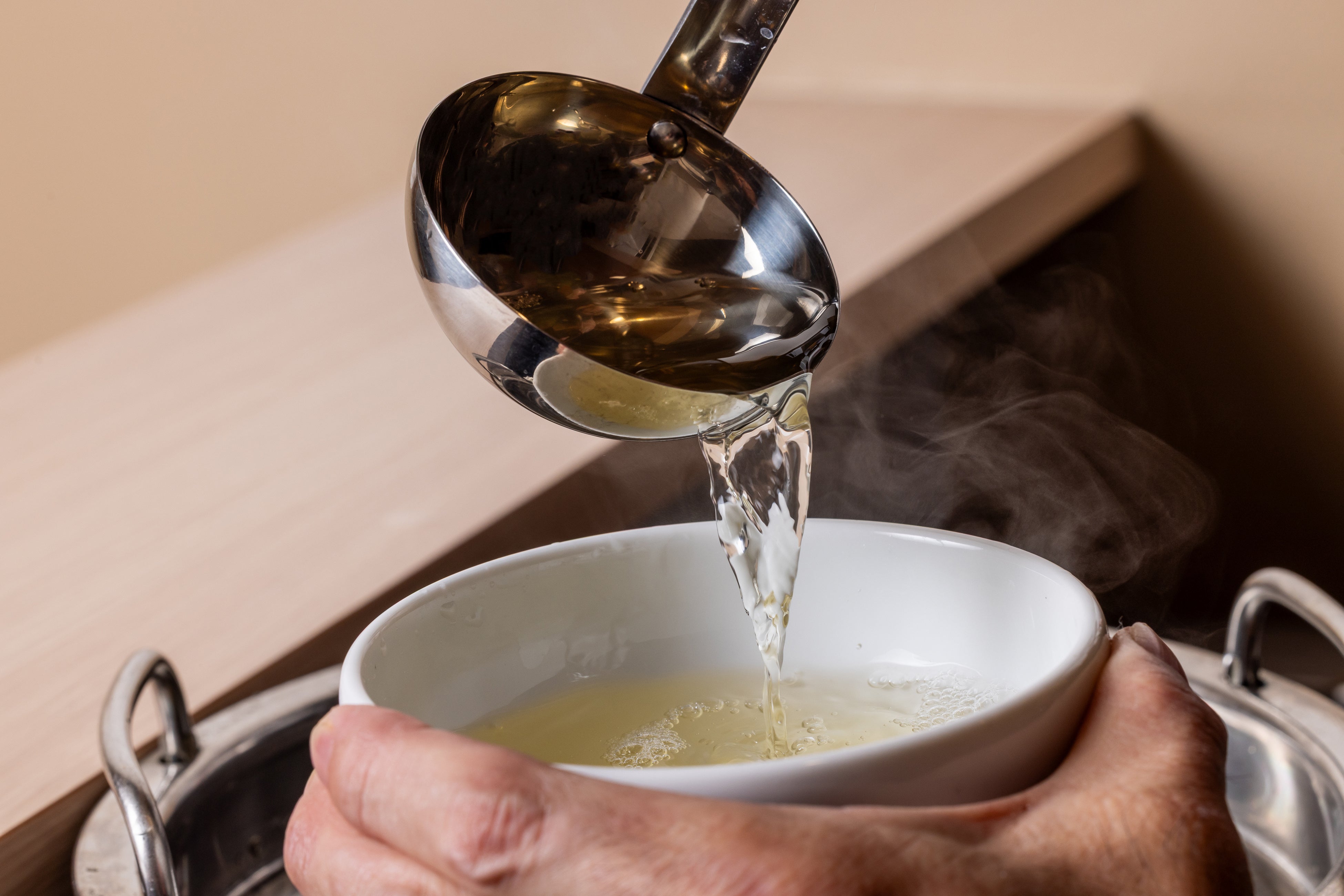 昆布といりこを前日から水出しし、カツオ・鯖・いわし節を合わせて仕上げた香り高い出汁。三河みりん、愛媛田中屋の醤油、種子島の洗双糖を使用。