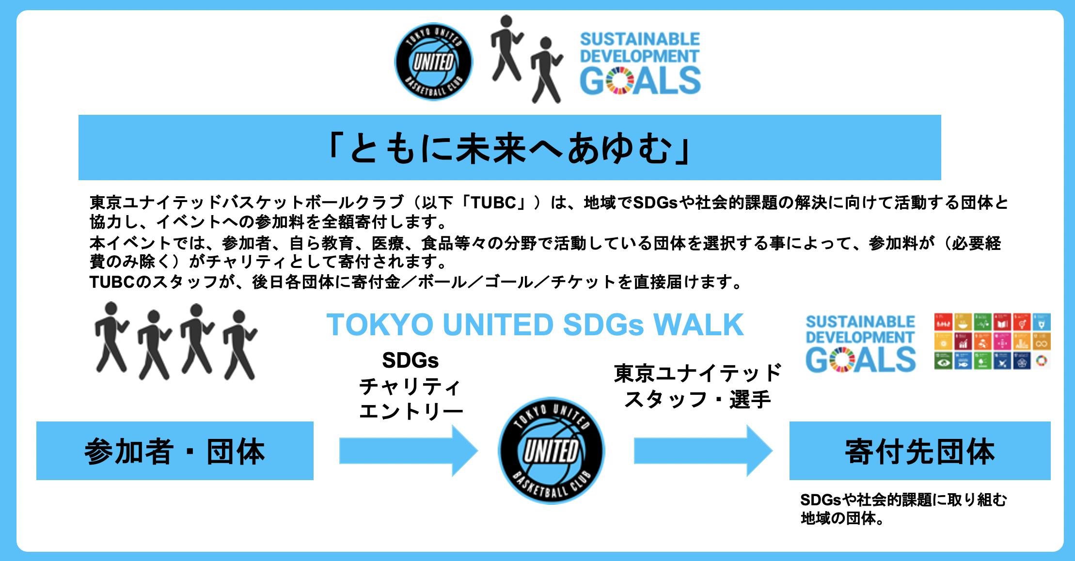 TUBCは、人と人のコミュニケーションを生み出し、地域の良さを再発見することを通して、 『地域の人と人、人と街』をつなぐスポーツクラブとして、一人ひとりにウェルビーイングのある社会の実現を目指します。 是非、本イベントに参加いただき、ウォーキングを通じて心身の健康と社会的課題の解決について、TUBCと共に考えていきましょう!