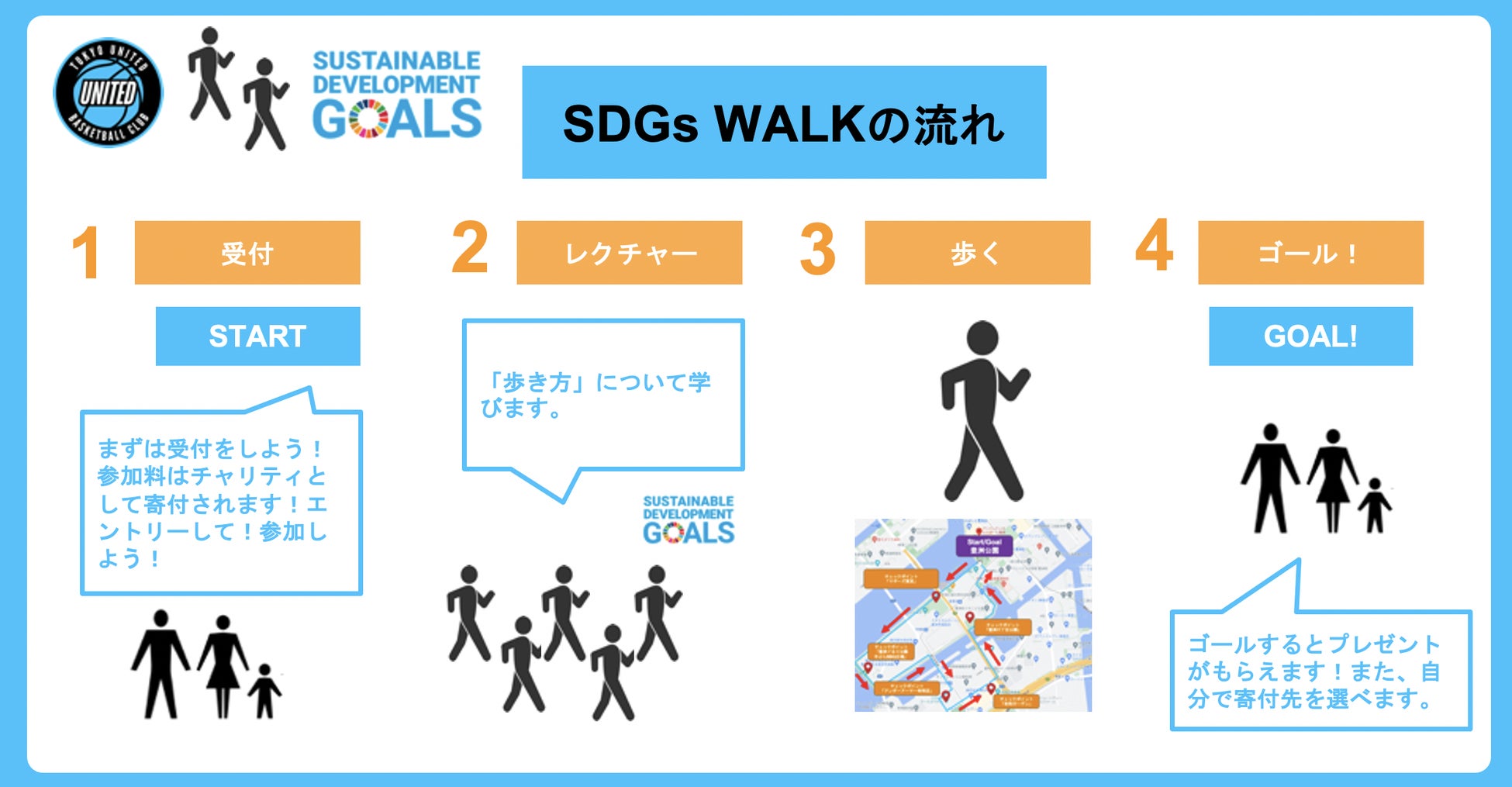 この「TOKYO UNITED SDGs WALK」は誰もが気軽に参加できるウォーキングイベントを通じて、湾岸エリアの街並みを楽しみながら健康促進に寄与するイベントです。「TOKYO UNITED SDGs WALK」の参加料は全額、SDGsに取り組む団体や社会的課題の解決に向けて活動する団体へ寄付し、今回は 教育、医療、食品等々の分野で活動している4団体にご賛同いただき参加者自らがどの団体に寄付するのかを選択することができます。