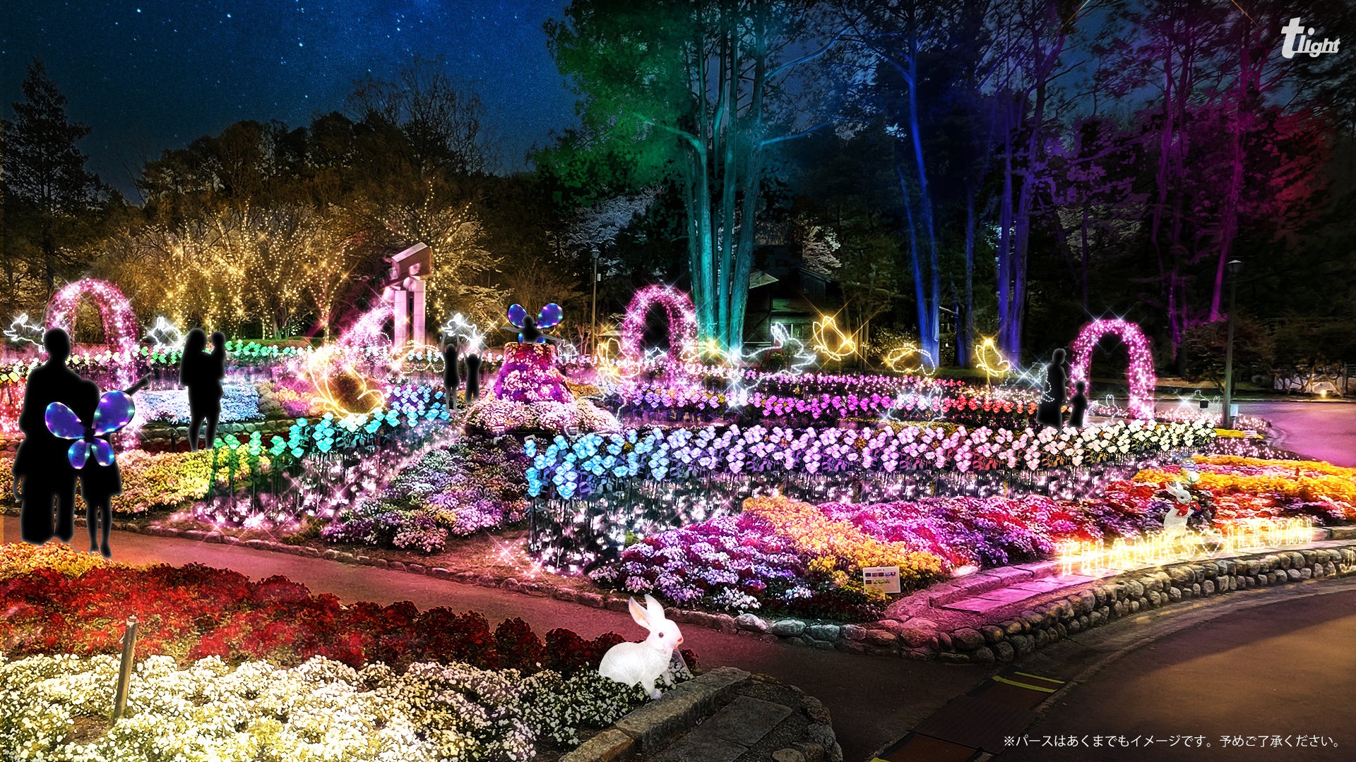 花壇一面を彩る季節の花と、フルカラーで光る花が旅うさぎ達のおしゃべりや音楽に連動して美しく表情を変える「光のショー」で皆様をお迎えいたします。うさぎと、蝶のモチーフや光のアーチが加わり、より立体的で躍動感のある演出をお楽しみいただけます。
