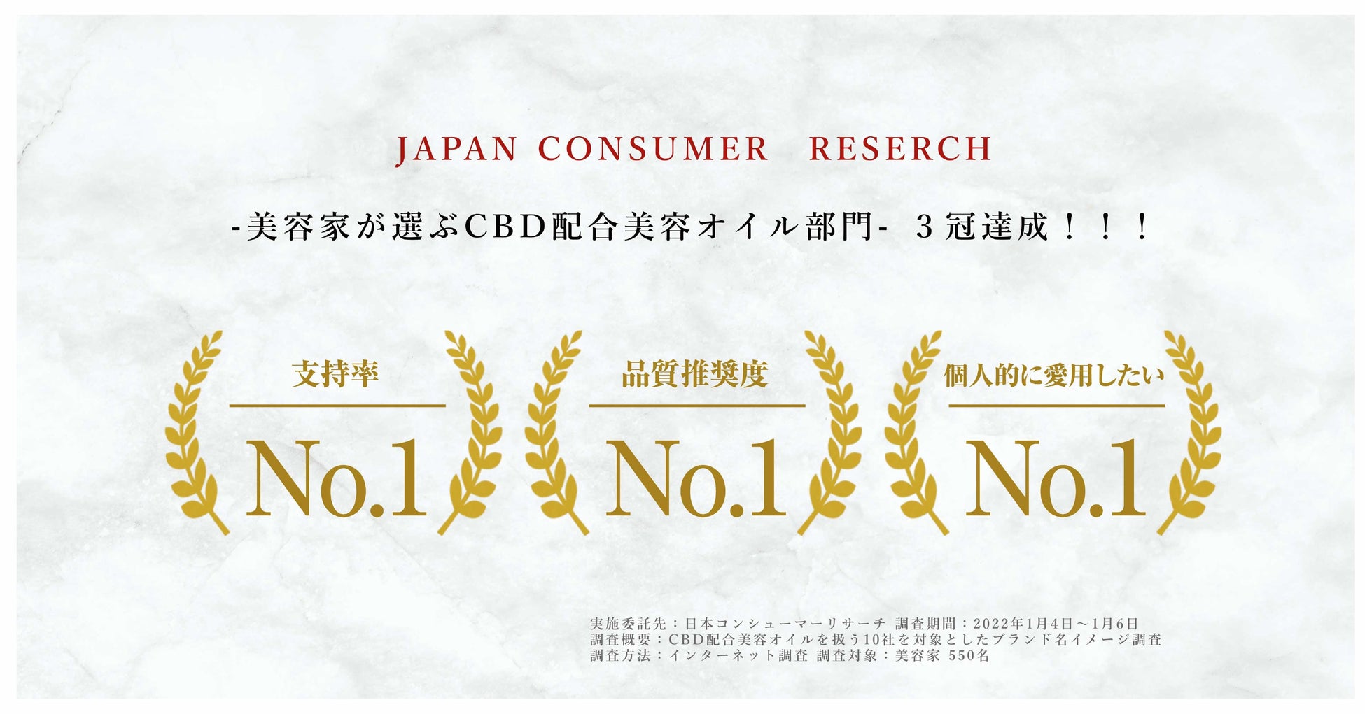 日本コンシューマーリサーチ美容家を対象としたCBD美容オイル調査を実施。CBDミューコンセントレートオイルが見事3冠達成いたしました。