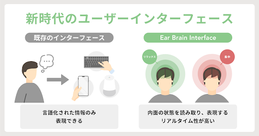 当社は外耳道から脳波をはじめとする生体情報を取得できるEar Brain Interfaceを小型化技術、ドライフレキシブル電極などを開発することで実用化いたしました。これら技術により、イヤホンという自然な見た目かつ、従来の脳波測定デバイスにはない簡便な装着方法で、どなたでも日常シーンで脳情報を活用することが可能です。