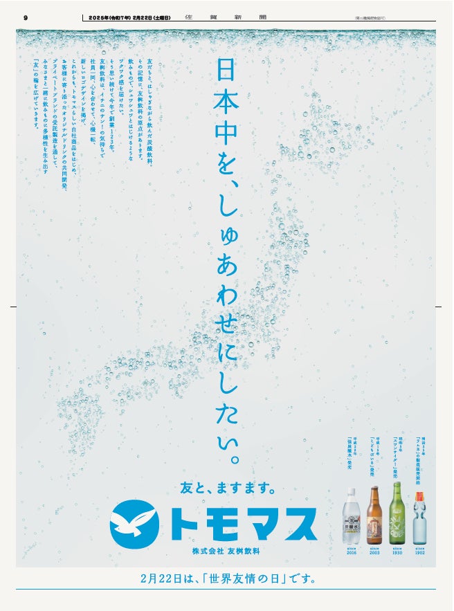 株式会社友桝飲料(代表:友田諭、本社:佐賀県小城市小城町岩蔵2575-3)は、2025年2月22日「世界友情の日」よりコーポレートロゴ・スローガンを刷新いたしました。
