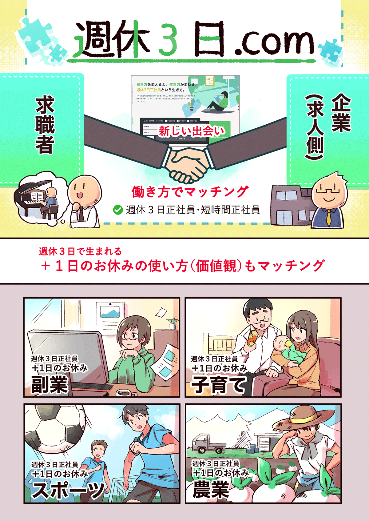 週休3日.comは、新卒就職・転職・移住をお考えの皆様に週休3日正社員・短時間正社員などの求人情報(新しい働き方の選択肢)をご紹介する求人情報サイトです。週休3日正社員を選ぶことで生まれる+1日のお休みの時間の使い方を共感・応援してくれる企業を探すことができる「+1日マッチング」という機能が特徴です。