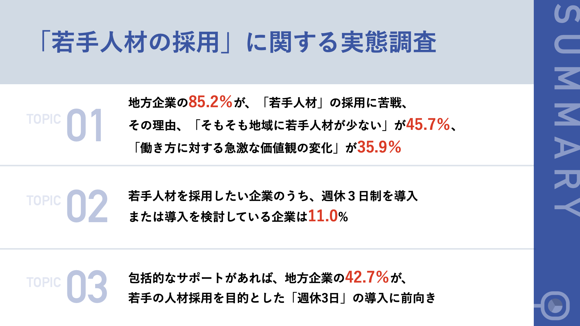 地方企業の8割超が「若手人材」の確保に苦戦 42.7%が、サポートありなら「週休3日」導入を検討