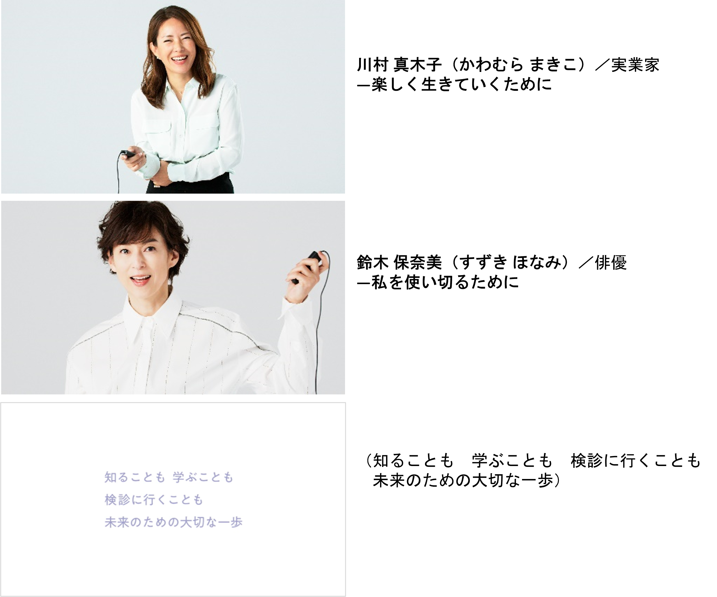 A.)(昨年の)10月のイベントに引き続き、今回も撮影に参加させていただけてすごく嬉しかったです。「自分自身を知ろう」(というテーマのもと)学べる機会をいただけて私自身たくさん勉強になりましたし、女性は妊娠と出産があるので、今のカラダを知るというのはライフプランを立てるうえですごく大切なことで、非常に(多くの方の)参考になるのではないかと思いました。とても光栄に思います。