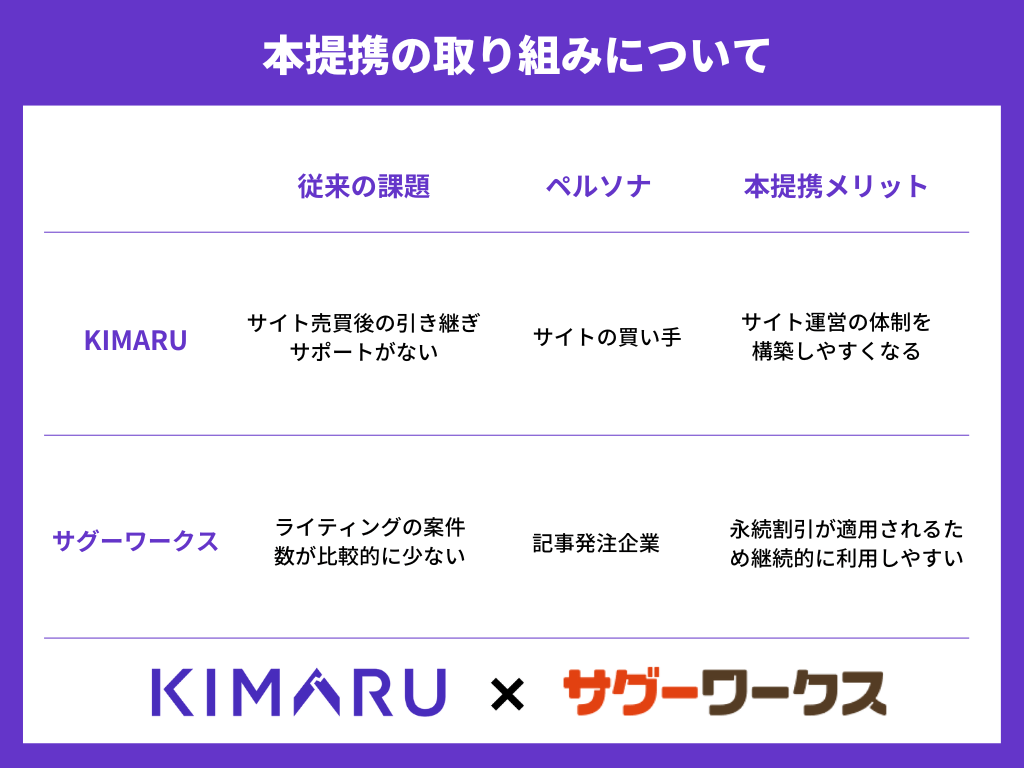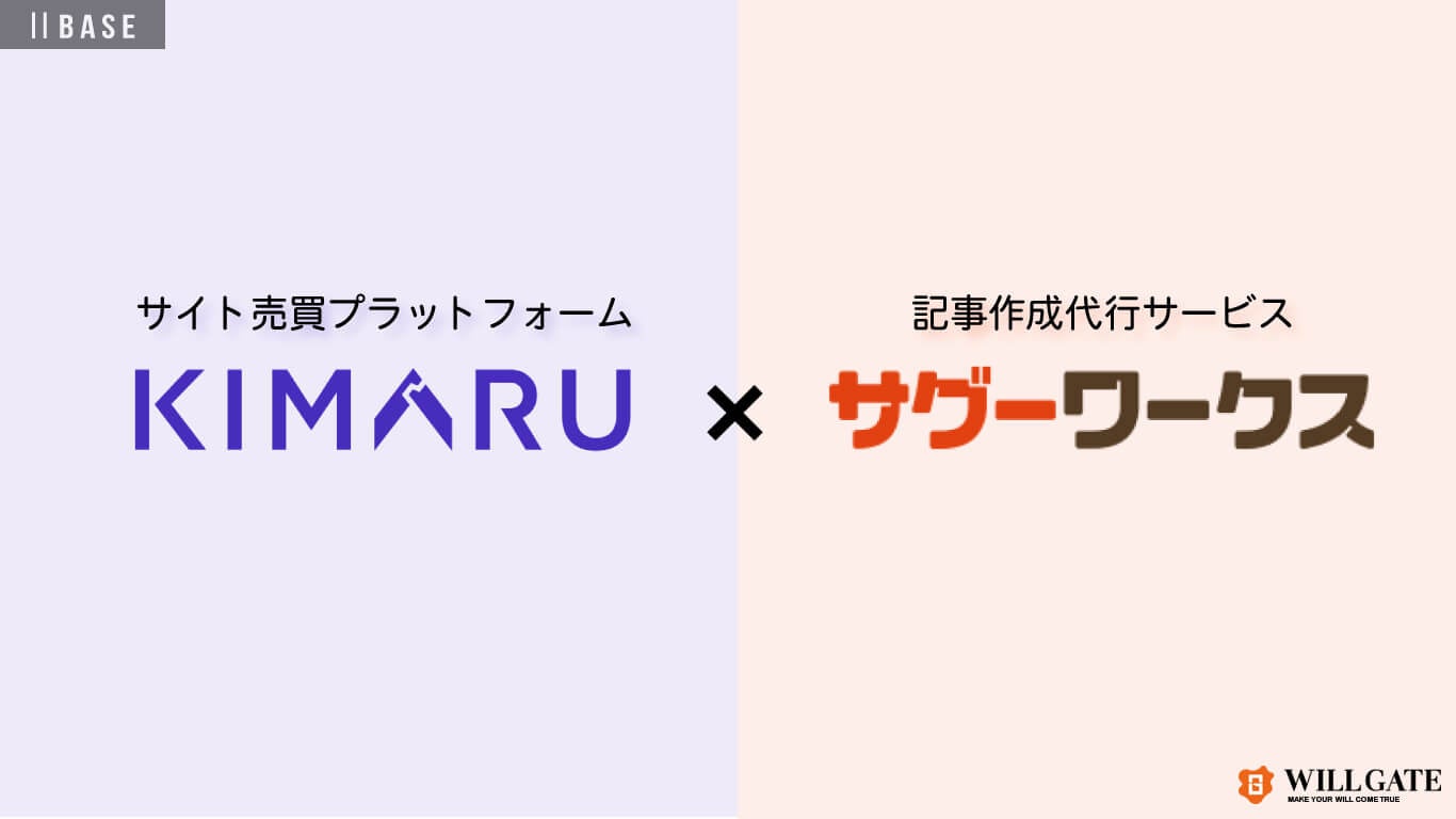 株式会社ツーベイスのサイト売買(M&A)プラットフォーム「KIMARU」と株式会社ウィルゲートの記事作成代行サービス「サグーワークス」が業務委託契約を締結。