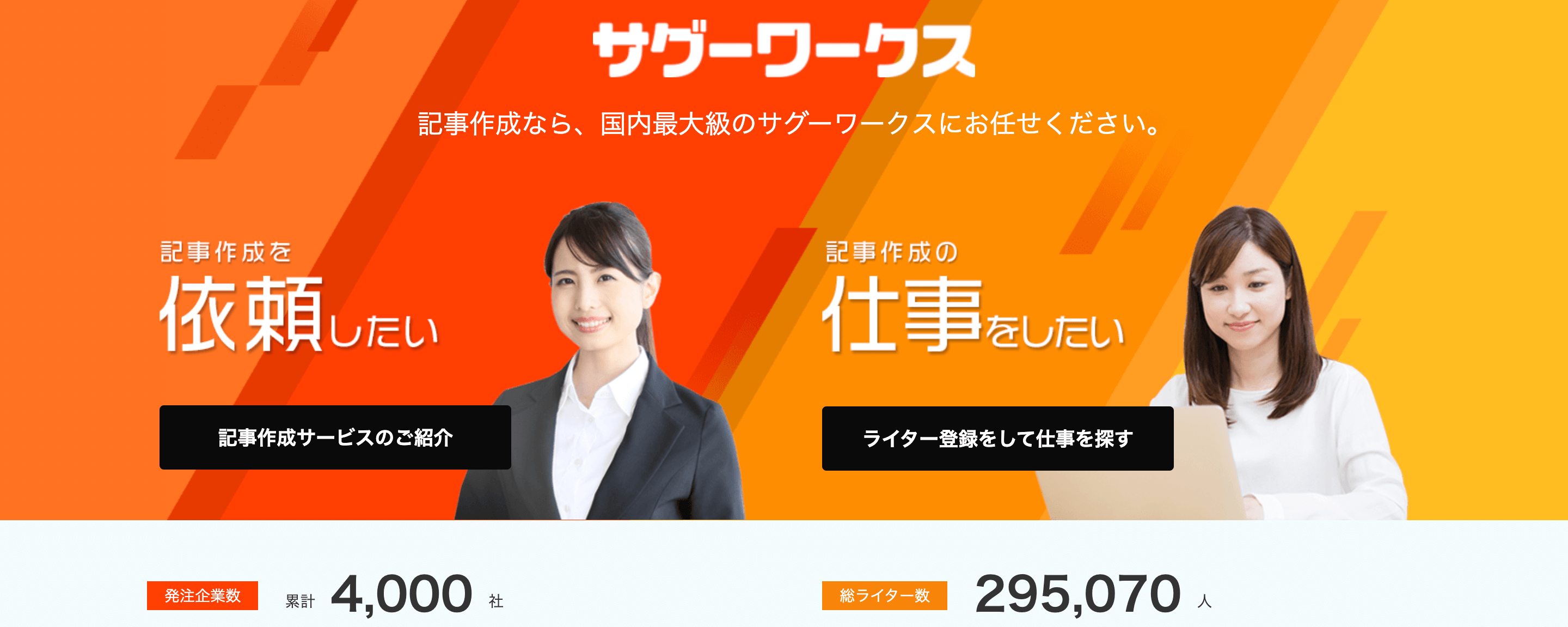 記事制作を依頼/外注したい発注企業4000社、Webライティングを仕事にしたいライター約30万人の両方を繋ぐプラットフォーム的な役割を果たしています。