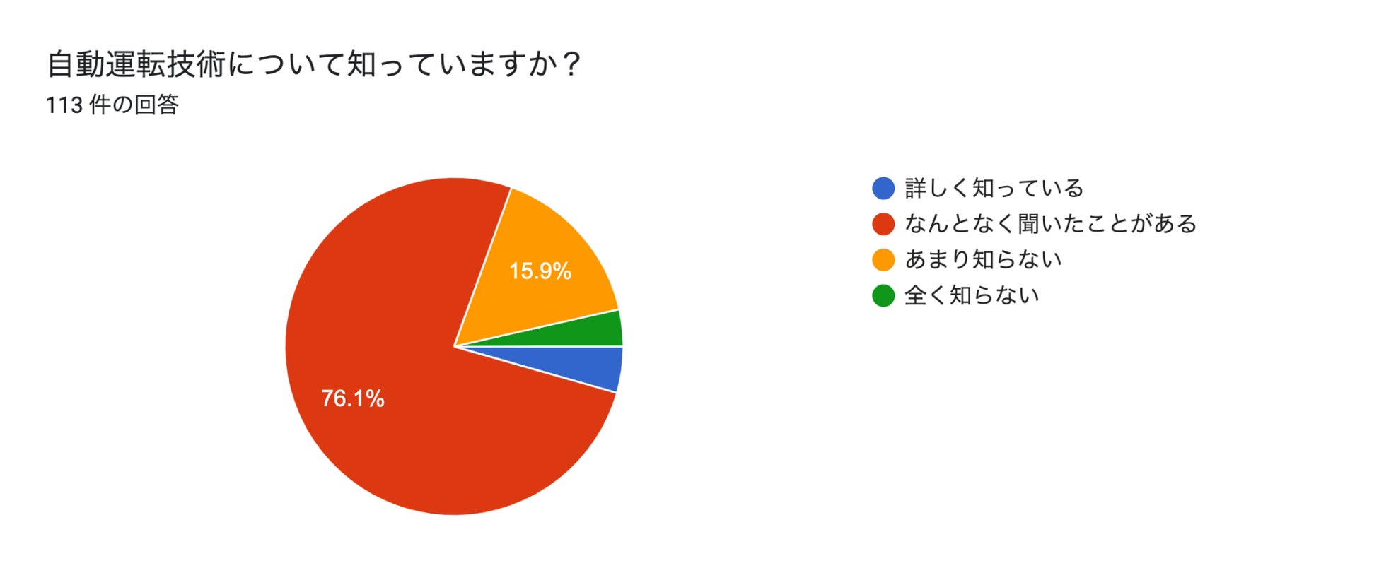 自動運転技術についての認知状況を聞いたところ、「なんとなく聞いたことがある」が約76%と多数を占めました。一方で「詳しく知っている」人は少なく、理解度にはバラつきが見られます。言葉自体は広く知られているものの、仕組みや法制度などの詳しい内容までは浸透していない様子がうかがえました。