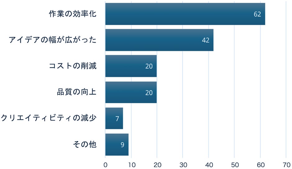 顕著に変化を及ぼしているのは「作業の効率化」と「アイデアの幅が広がった」。「コストの削減」「品質の向上」の実感は少ない。