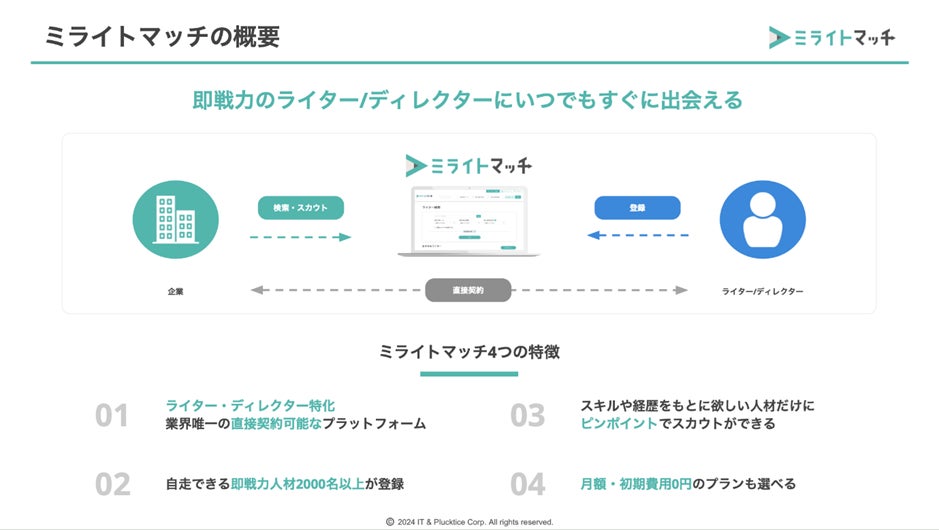 ミライトマッチは、ニーズの数だけライター・ディレクター人材が見つかるプラットフォームです。いくら記事を発注しても手数料0円、最適な人材が最短即日で見つかる、業界経験のあるエージェントが手厚くサポート、ライター・ディレクターと事前の面談や直接契約もできる……これまでクラウドソーシングで発生しがちな課題を解決するために誕生しました。