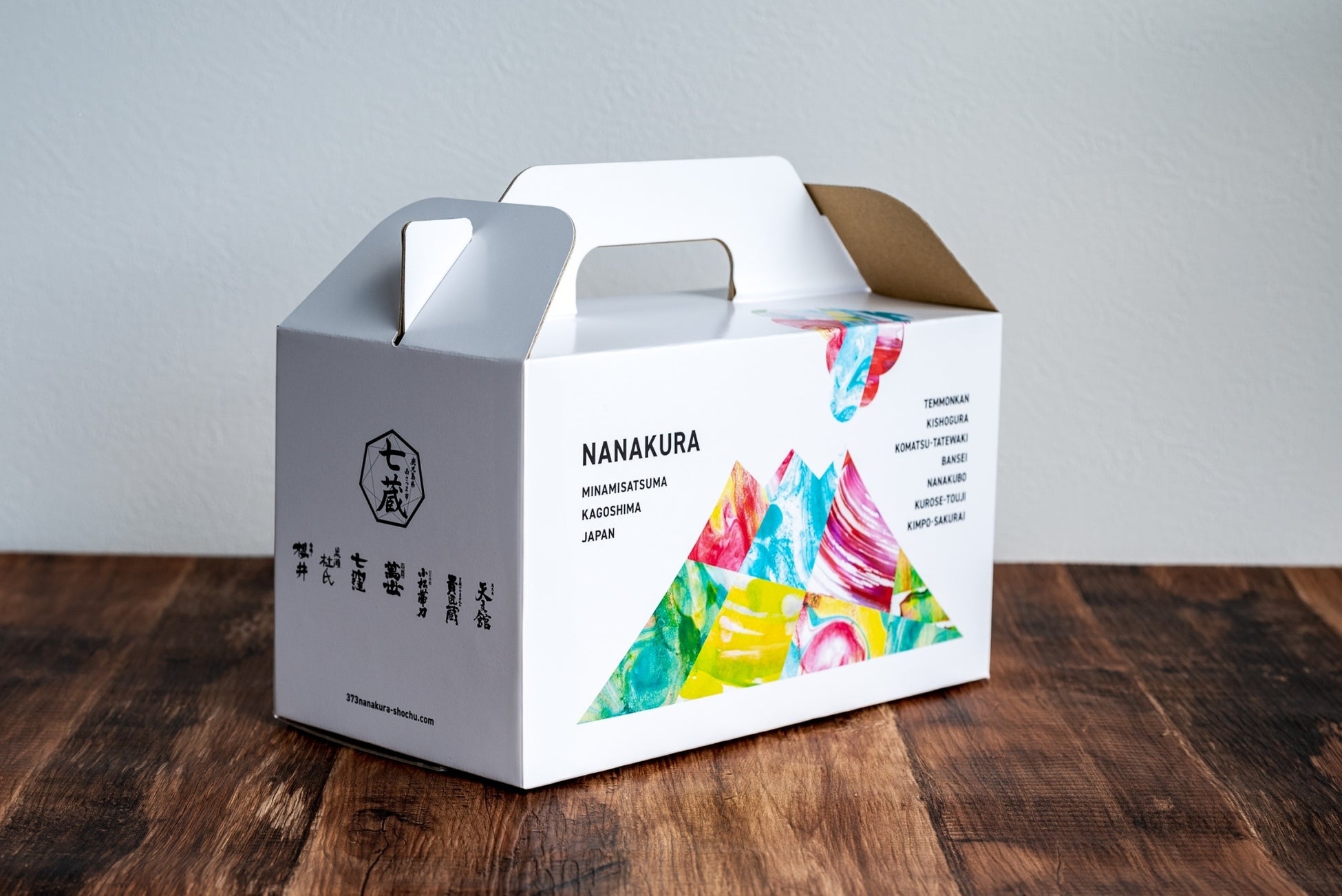 各銘柄180mlのミニボトルセットを作成。従来の茶色のガラスボトルと古風なラベルのビジュアルを一新。各銘柄の味わいや割ったときの風合いをイメージしたラベルデザインに、ローマ字表記した銘柄の名称、七蔵のロゴマークを、透明なガラスボトルにあしらいました。
