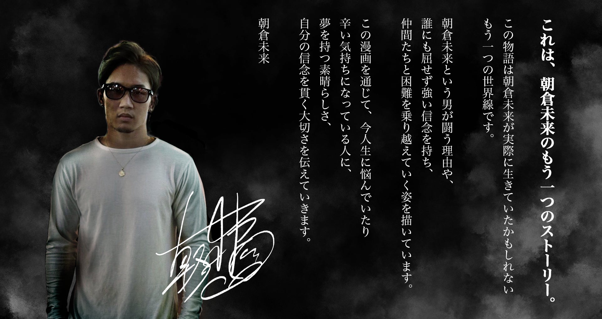 「この物語は朝倉未来が実際に生きていたかもしれないもう一つの世界線です。朝倉未来という男がなぜ闘うかや、誰にも屈せず強い信念を持ち、仲間たちと困難を乗り越えていく姿を描いています。この漫画を通じて、今人生に悩んでいたり辛い気持ちになっている人に、夢を持つ素晴らしさ、自分の信念を貫く大切さを伝えていきます。」とコメントしています。