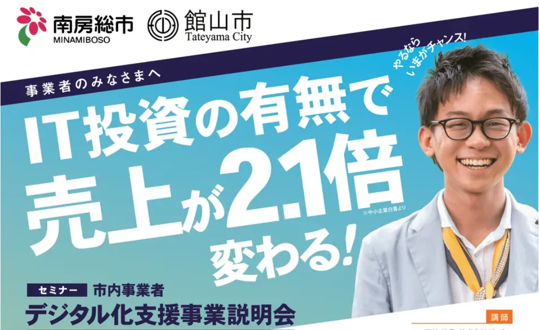 千葉県南房総市と館山市は、千葉県の南端にある隣接した2市です。この2市が共同で「市内事業者デジタル化支援事業」を行っています。これは「南房総市及び館山市内事業者を対象としたデジタル技術の啓発、導入及び導入後の自走運営に向けた伴走支援などを一貫して支援することにより、市内事業者のデジタル化による事業収益の改善を支援することを目的とする」ものです。
