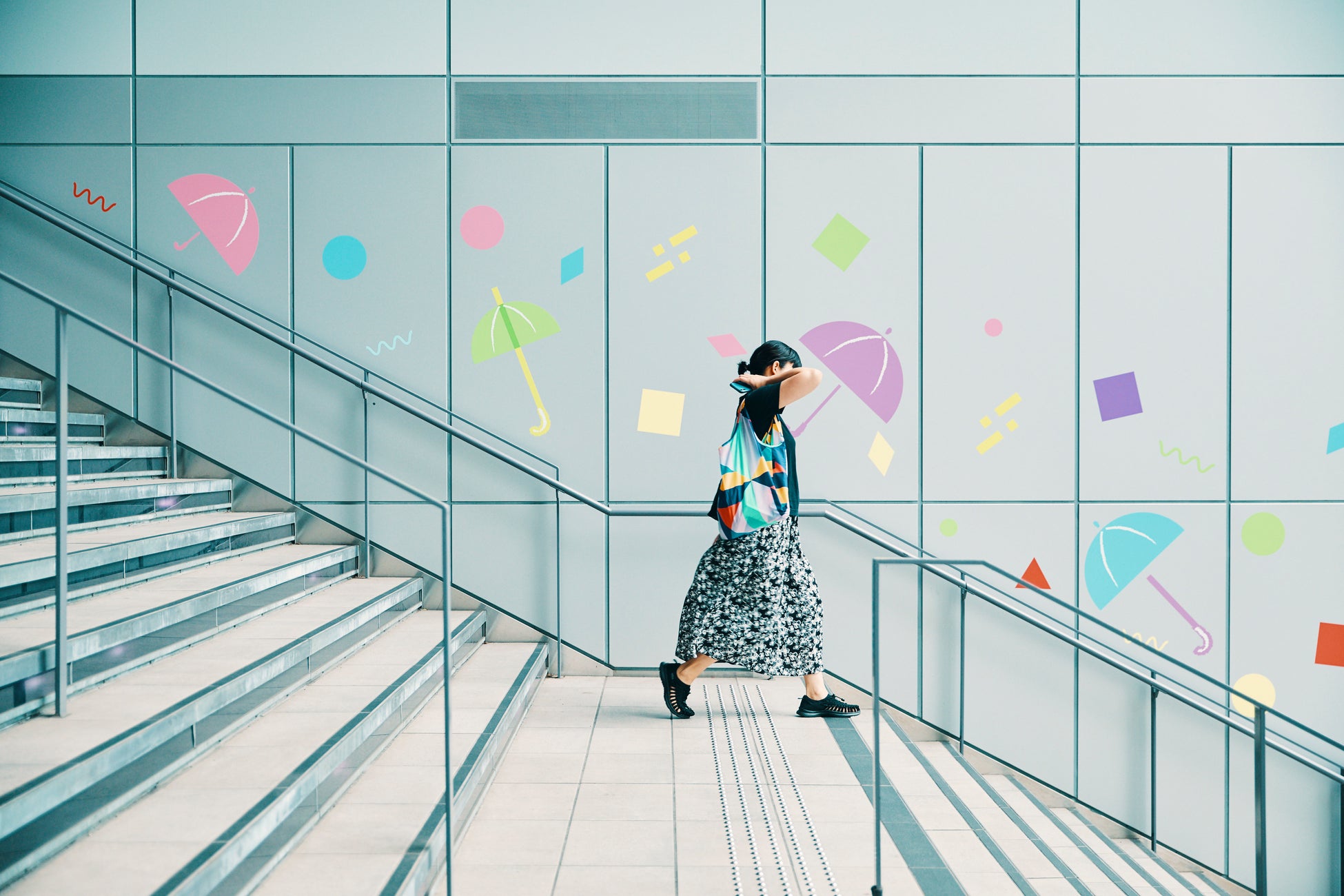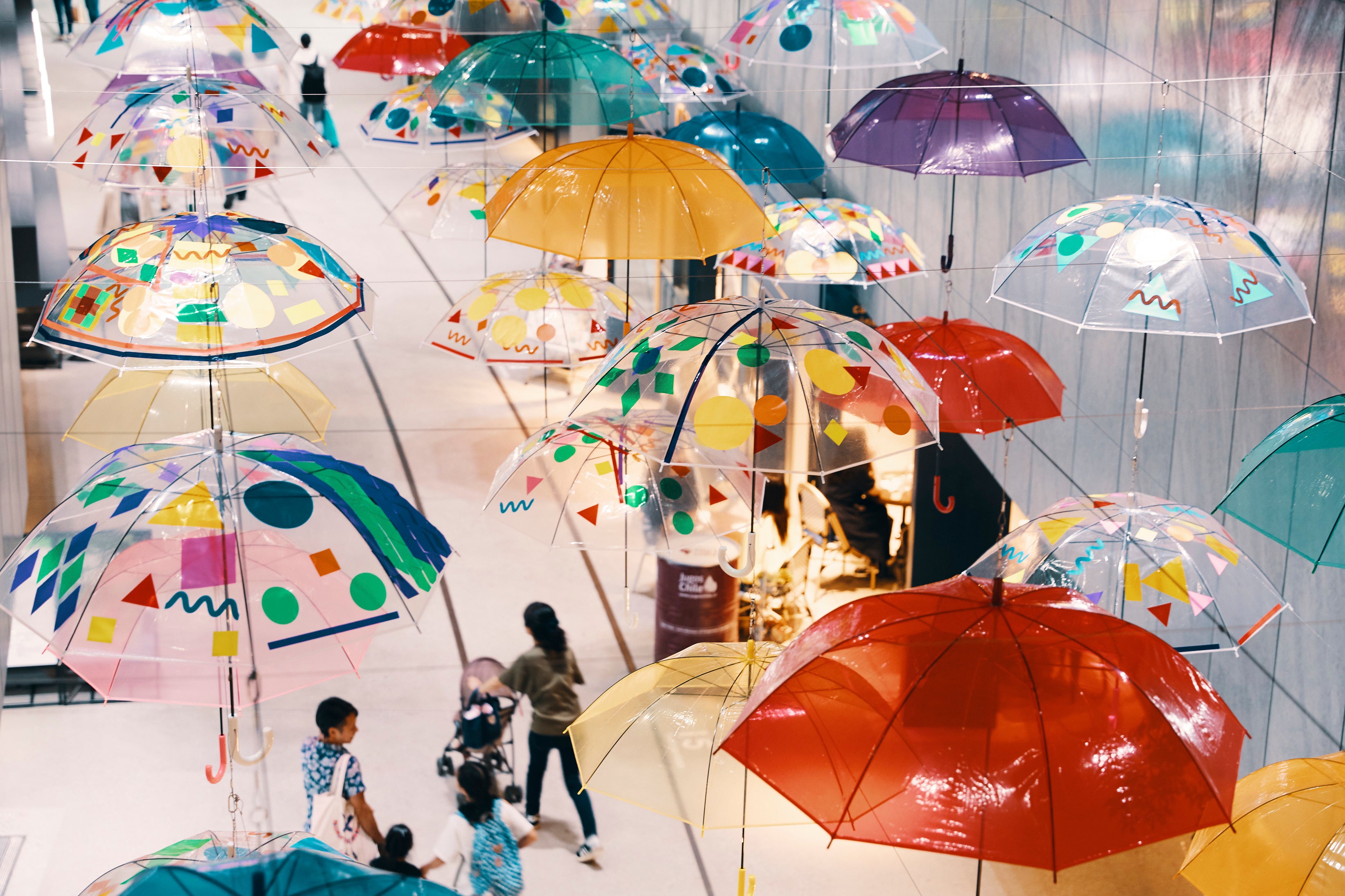 428(シブヤ)の日およびゴールデンウィークに向けて、色とりどりの傘が館内を彩ります。傘は渋谷駅と代官山駅をかつて繋いでいた線路跡地に建つ渋谷ブリッジA棟内にある保育所型認定こども園「渋谷東しぜんの国こども園 small alley」の園児のみなさまがデザインしたもの!傘を飾るだけでなく、渋谷ストリームのシンボルである大階段の演出もこのイベントだけの特別バージョンに。気分が暗くなりがちな梅雨の時期、明るいアンブレラスカイを見上げながら、渋谷ストリームをお楽しみください。