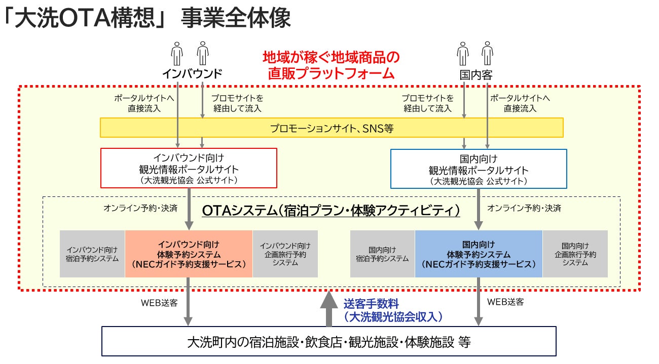 一般社団法人大洗観光協会(本社:茨城県大洗町/会長:大里明)は、NECソリューションイノベータ株式会社(本社:東京都江東区/代表取締役 執行役員社長::石井力)と、茨城県大洗町の観光やアクティビティの検索・予約・決済が可能な地域版OTA(Online Travel Agency)システム(以下、OTAシステム)を開発しました。これにより、観光客はスマホひとつで旅マエ・旅ナカにおいて、観光情報の収集やアクティビティ・入館券・飲食店などの予約や購入が可能になります。また、利益の一部は町内事業者の販売促進に寄与する支援に活用するなど地域の観光振興に還元されるビジネスモデルとすることで、地域経済の活性化に貢献します。このシステムとビジネスモデルにより大洗町内の観光DXを推進し、地域経済を発展させ、大洗町の観光産業における魅力と利便性向上を目指します。