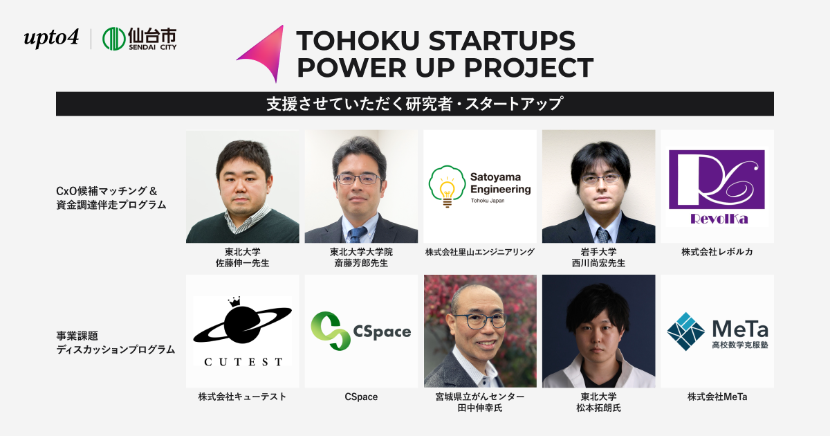 upto4株式会社(本社:東京都中央区、代表取締役社長:棟兼彰一、以下upto4)は、仙台市の「首都圏等スタートアップ支援ネットワーク構築業務」を受託し、仙台・東北の起業家・スタートアップの事業の成功確度向上を目指した「TOHOKU STARTUPS POWER UP PROJECT」において、創業前後の研究者・スタートアップを支援する「CxO候補マッチング& 資金調達伴走プログラム」「事業課題ディスカッションプログラム」の支援者10者を決定いたしました。