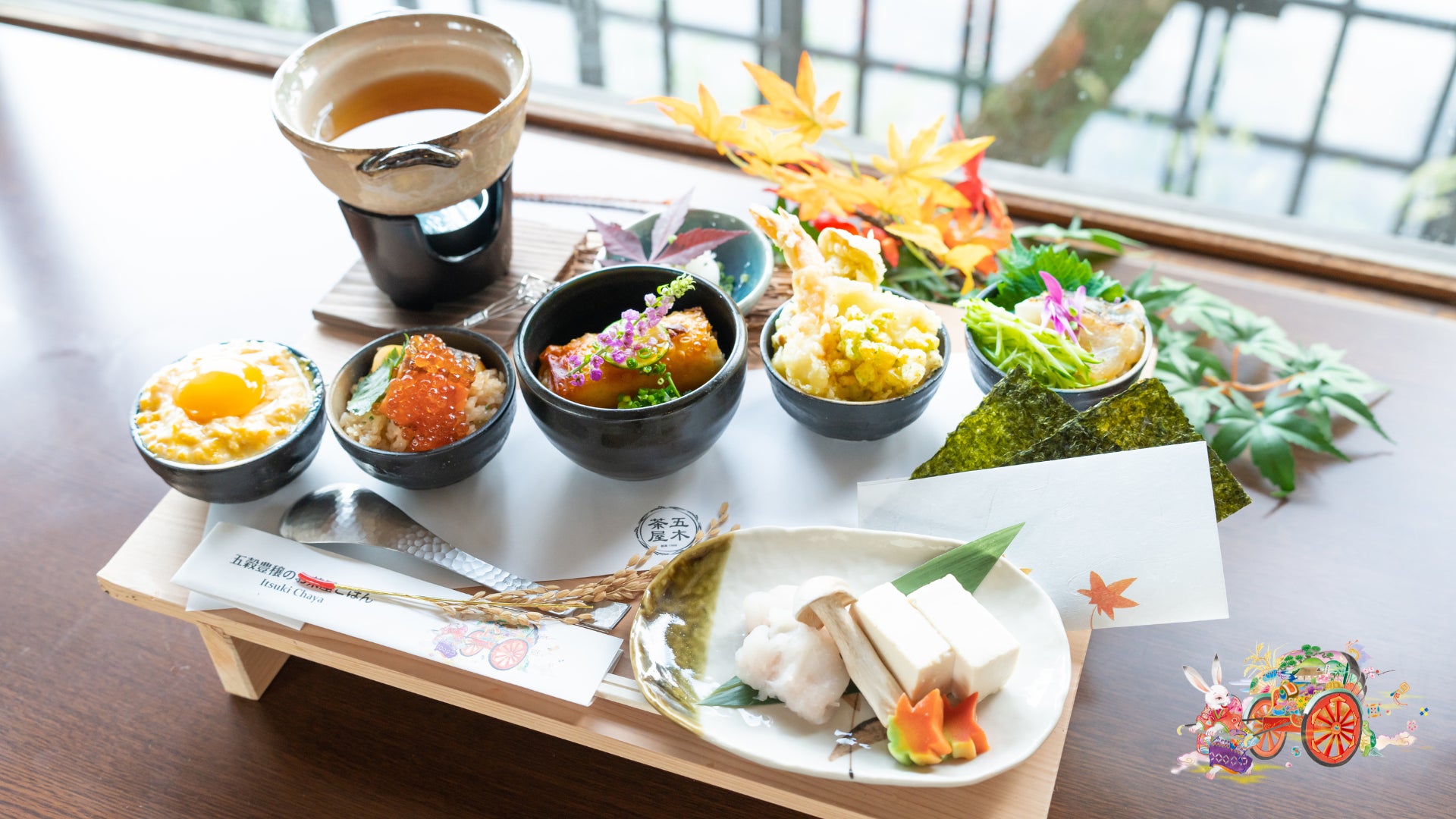 秋の京丼五種食べ比べ膳は、一番人気の「黄金の玉子丼」をはじめ、寒くなってくる季節にぴったりな鱧しゃぶと湯豆腐をご提供します。
