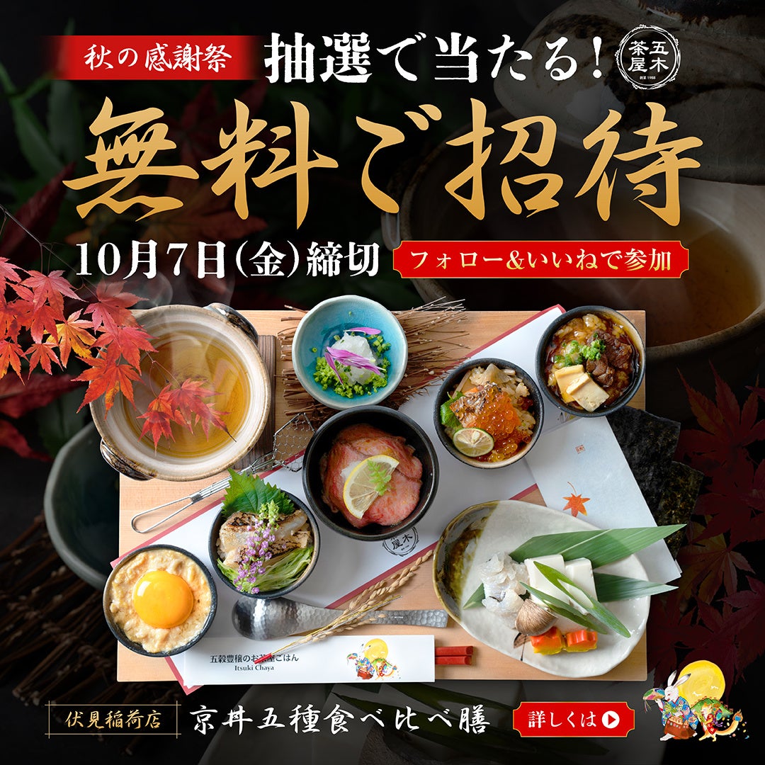 五穀豊穣を祈願した京丼五種食べ比べ膳が抽選で当たる、秋の無料ご招待の催しを開催中です。