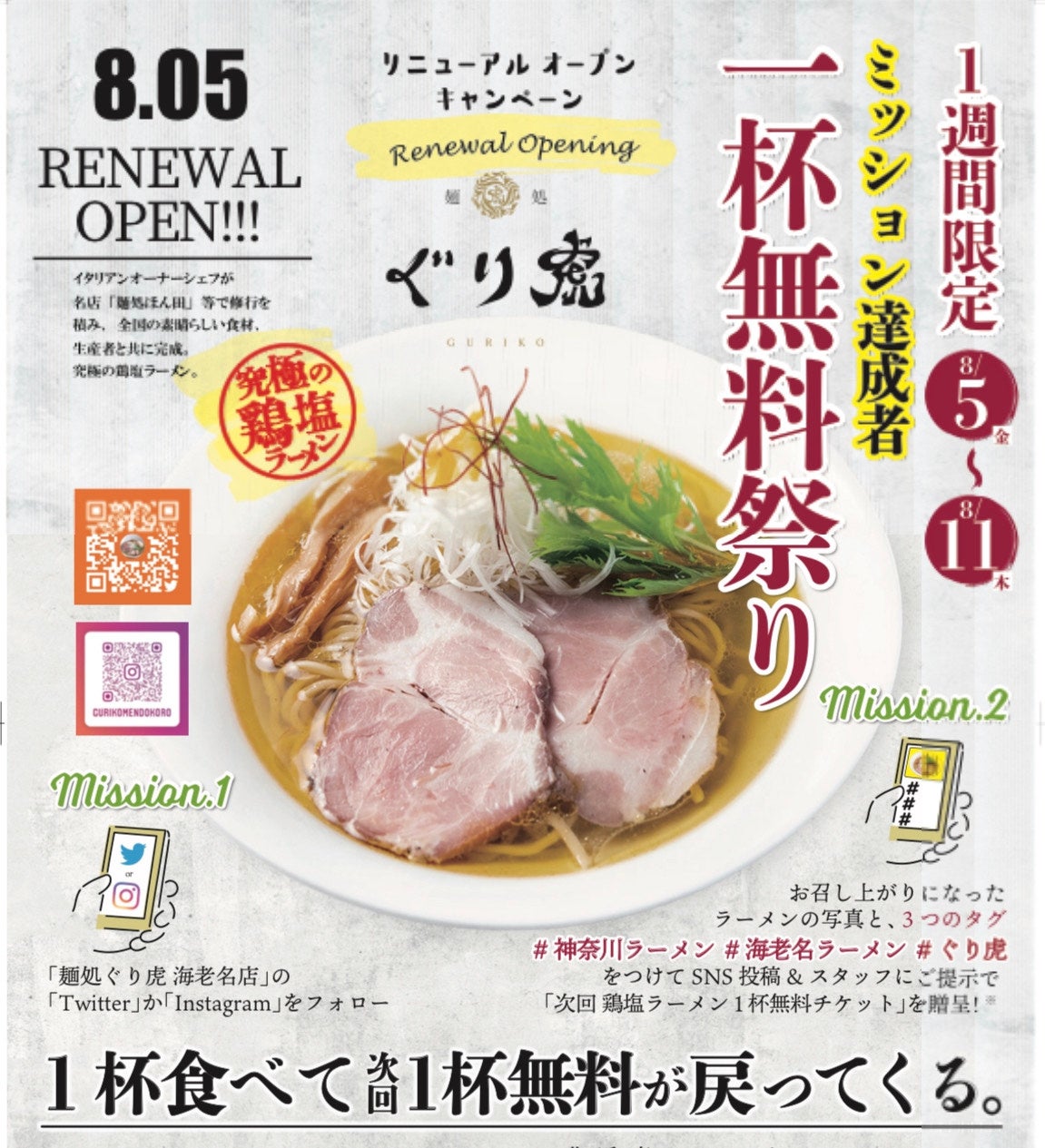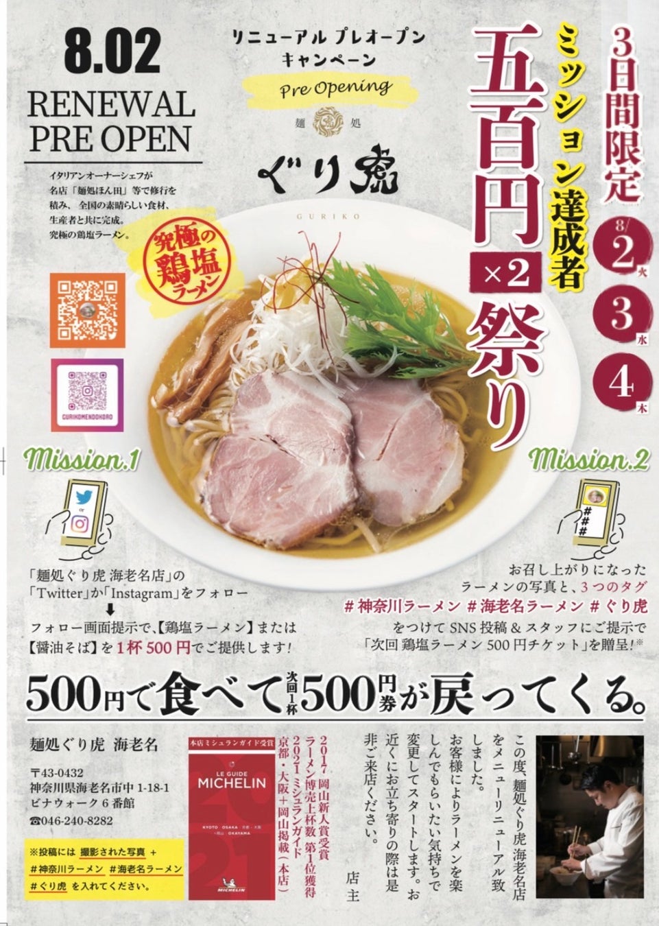 ミシュランガイド掲載ラーメン店 「麺処ぐり虎 海老名店」が8月2日(火)リニューアルオープン!キャンペーン8/2日~11日開催