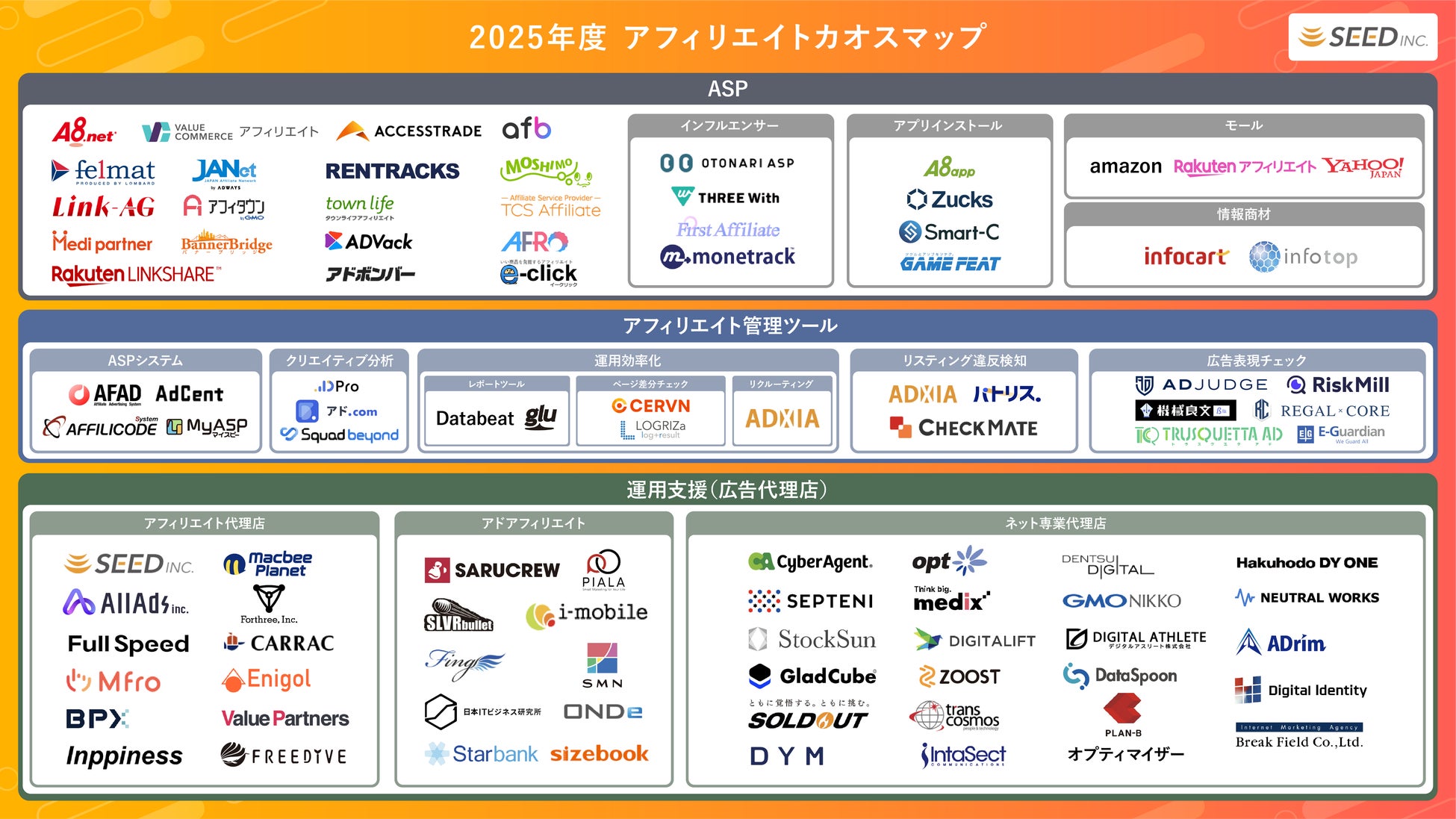 デジタルマーケティング支援事業を展開する株式会社シード(本社:東京都千代田区飯田橋 代表取締役:池田智之、以下 シード)は、独自の調査により、アフィリエイト広告に関連するサービス・ツールをまとめた「2025年度 アフィリエイト広告業界カオスマップ」を公開いたしました。