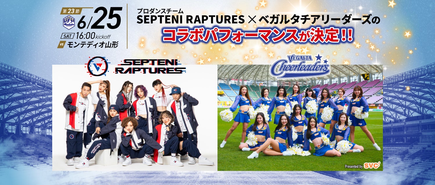 PERF株式会社(本社:東京都新宿区、代表取締役社長:柳裕貴)が運営する、日本発のプロダンスリーグ「第一生命 D.LEAGUE」に出場中の「SEPTENI RAPTURES(セプテーニ ラプチャーズ)」は、6月25日(土)開催の明治安田生命J2リーグ 第23節 ベガルタ仙台 対 モンテディオ山形戦にて、ベガルタチアリーダーズとのコラボパフォーマンスを実施いたします。