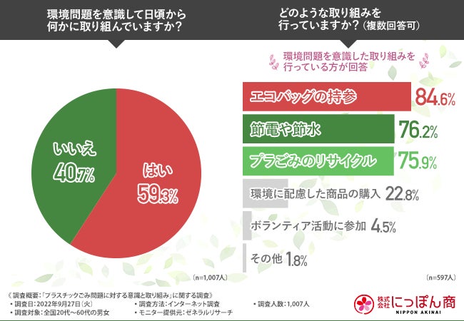 株式会社にっぽん商(本社所在地:千葉県船橋市、代表取締役:牧野 基明)は、全国20代~60代の男女を対象に、「プラスチックごみ問題に対する意識と取り組み」に関する調査を実施しました。