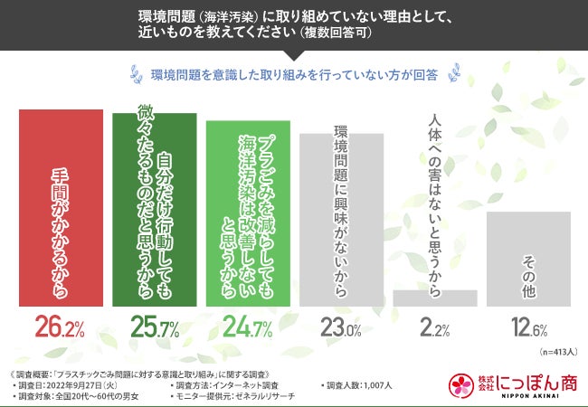 そこで、先程の質問でと回答した方に、「環境問題(海洋汚染)に取り組めていない理由として、近いものを教えてください(複数回答可)」と質問したところ、『手間がかかるから(26.2%)』と回答した方が最も多く、次いで『自分だけ行動しても微々たるものだと思うから(25.7%)』『プラごみを減らしても海洋汚染は改善しないと思うから(24.7%)』『環境問題に興味がないから(23.0%)』『人体への害は無いと思うから(2.2%)』と続きました。