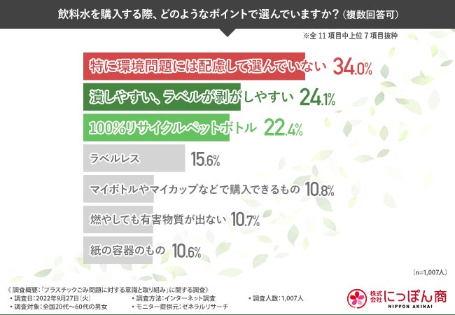 そこで、「飲料水を購入する際、どのようなポイントで選んでいますか?(複数回答可)」と質問したところ、『特に環境問題には配慮して選んでいない(34.0%)』と回答した方が最も多く、次いで『潰しやすい、ラベルが剥がしやすい(24.1%)』『100%リサイクルペットボトル(22.4%)』と続きました。