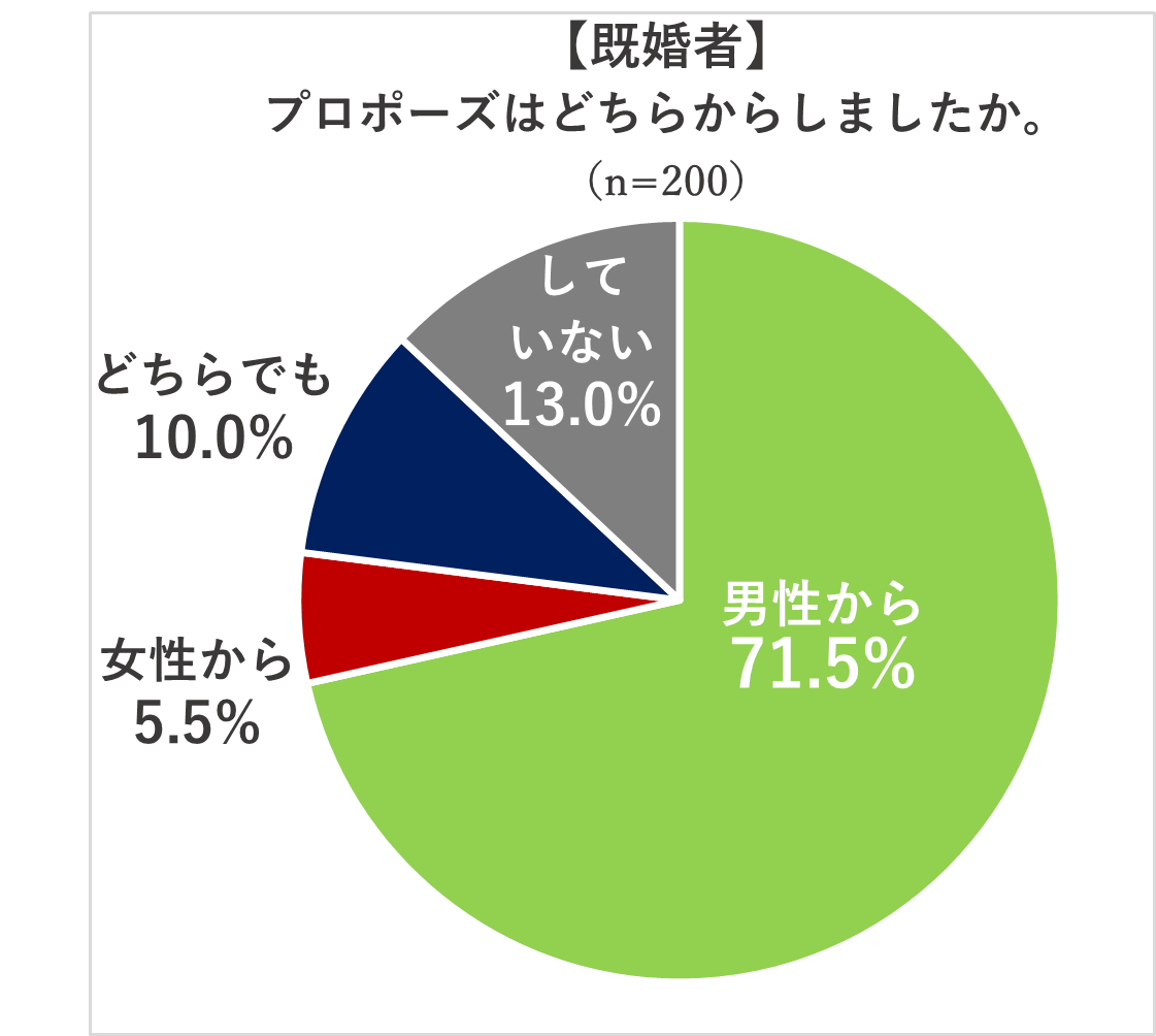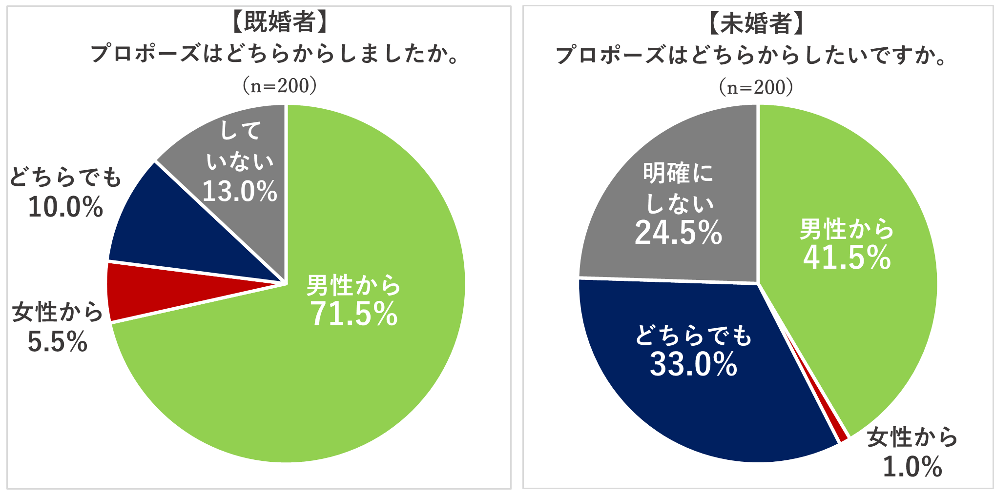 既婚者の7割が男性からプロポーズをしたと回答しているのに対し、未婚者で「男性からプロポーズしたい」と回答したのは4割で「どちらでもよい」が3割以上にのぼる結果となりました。「プロポーズは男性からするもの」というイメージが薄れてきていることが考えられます。