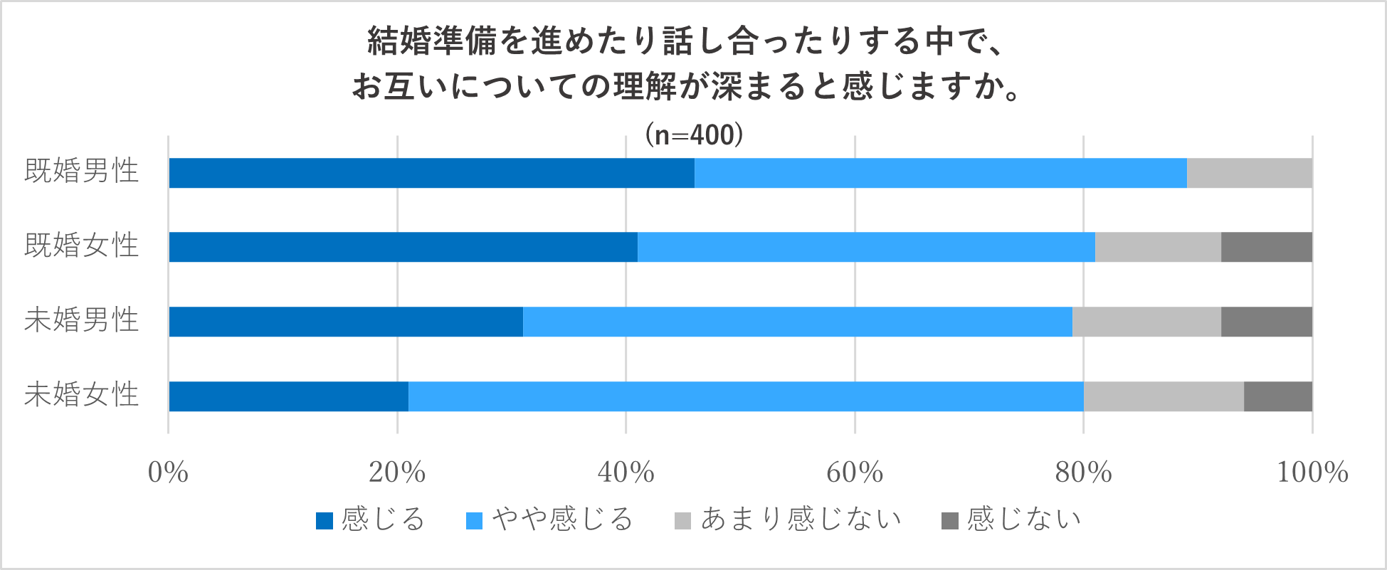 結婚準備を進める中で、お互いについての理解が深まると感じるかという問いに対して、既婚・未婚問わずに約8割以上が「理解が深まると感じる・やや感じる」と回答しました。
