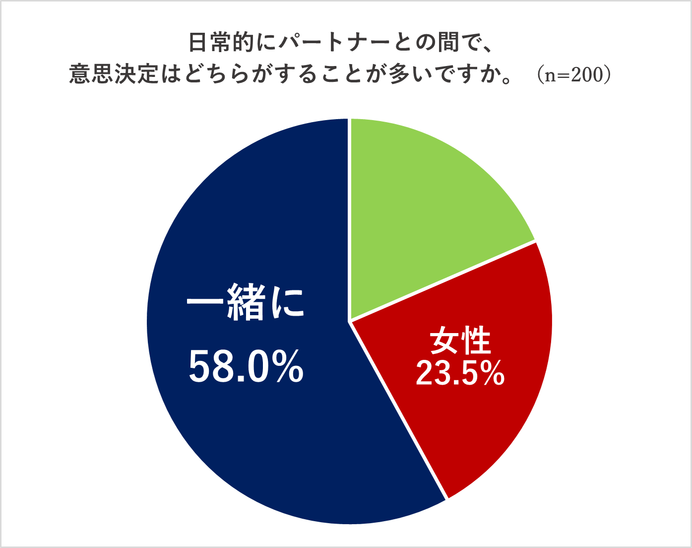 「日常的にパートナーとの間で、意思決定はどちらがすることが多いですか。」という質問に対し、既婚者の58%が「一緒に」と回答しました。亭主関白やかかあ天下といった言葉もありますが、どちらか一方ではなくお互いの意見を尊重し合う、二人三脚型の夫婦が過半数を占めていることがわかります。