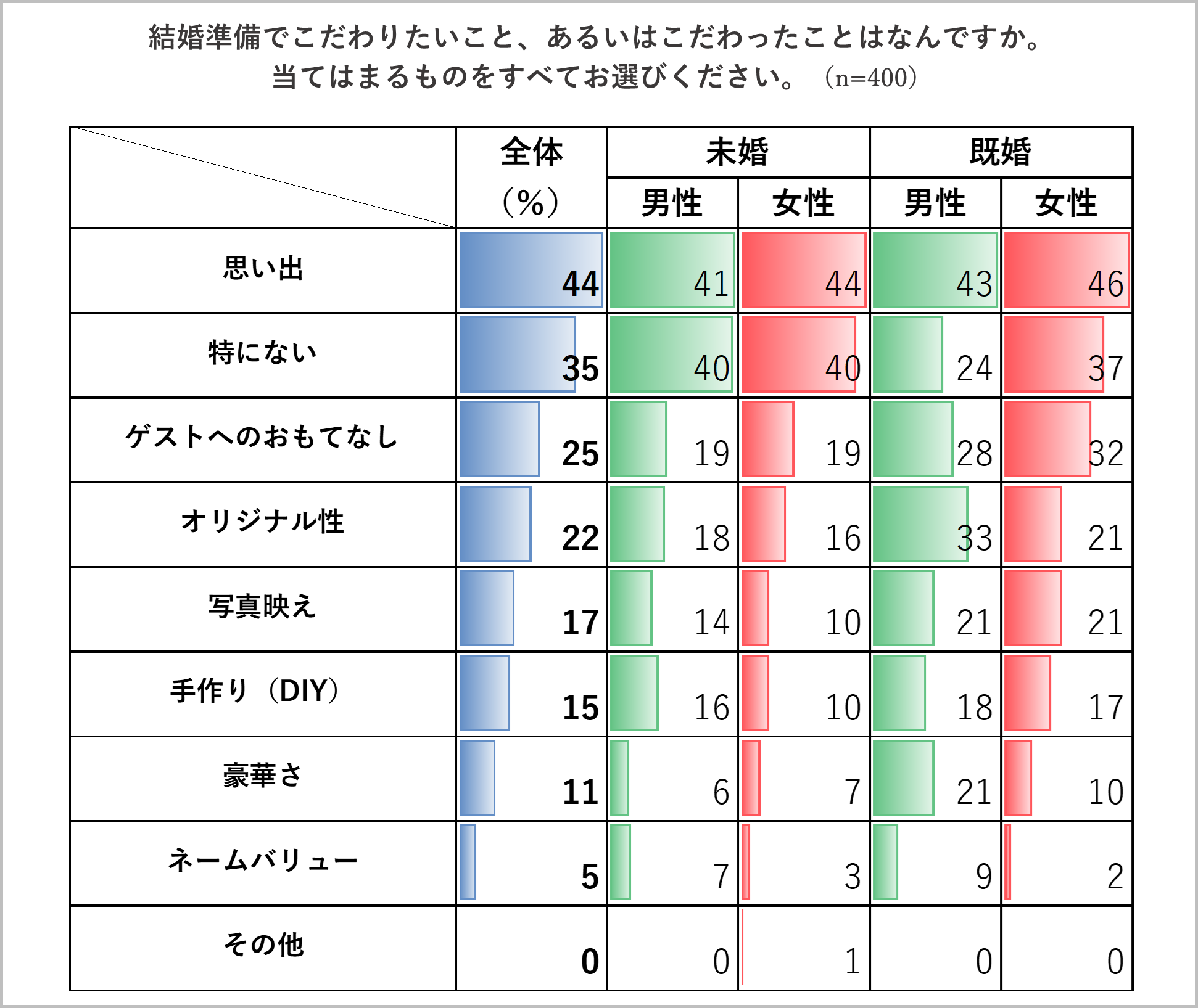 また、結婚準備を進める中で重要視したいことについては、「思い出に残ること」と回答した人が最も多い結果となりました。