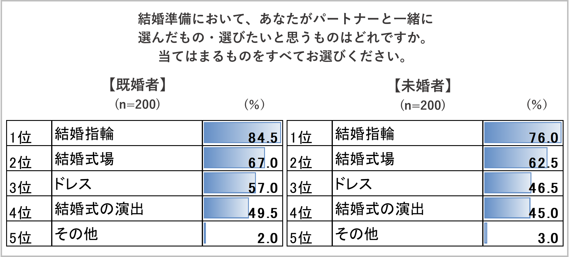 結婚準備において、パートナーと一緒に選びたいものを質問したところ、既婚者・未婚者ともに2位以下と大きく差をつけ、結婚指輪が1位という結果になりました。