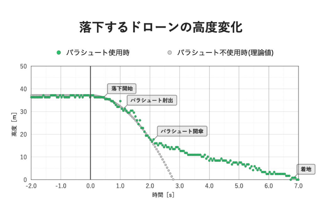 パラシュート不使用時は使用時と比べて、6倍以上の速度が発生することを実証実験にて確認しています。