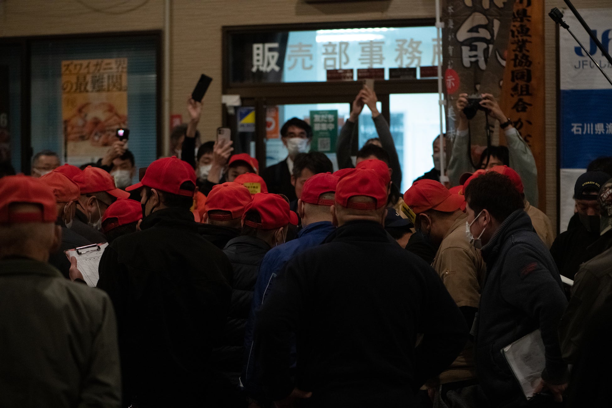 かなざわ総合市場では、石川県漁協 油谷市場長、加賀支所では橋本理事(いしかわ四季のさかなPR推進協議会会長)より、「輝姫」のブランド立ち上げの背景や特長などを発表後、加能ガニ(「蟹-1(カニワン)グランプリ」)、「輝姫」、「輝」の順でスタート。