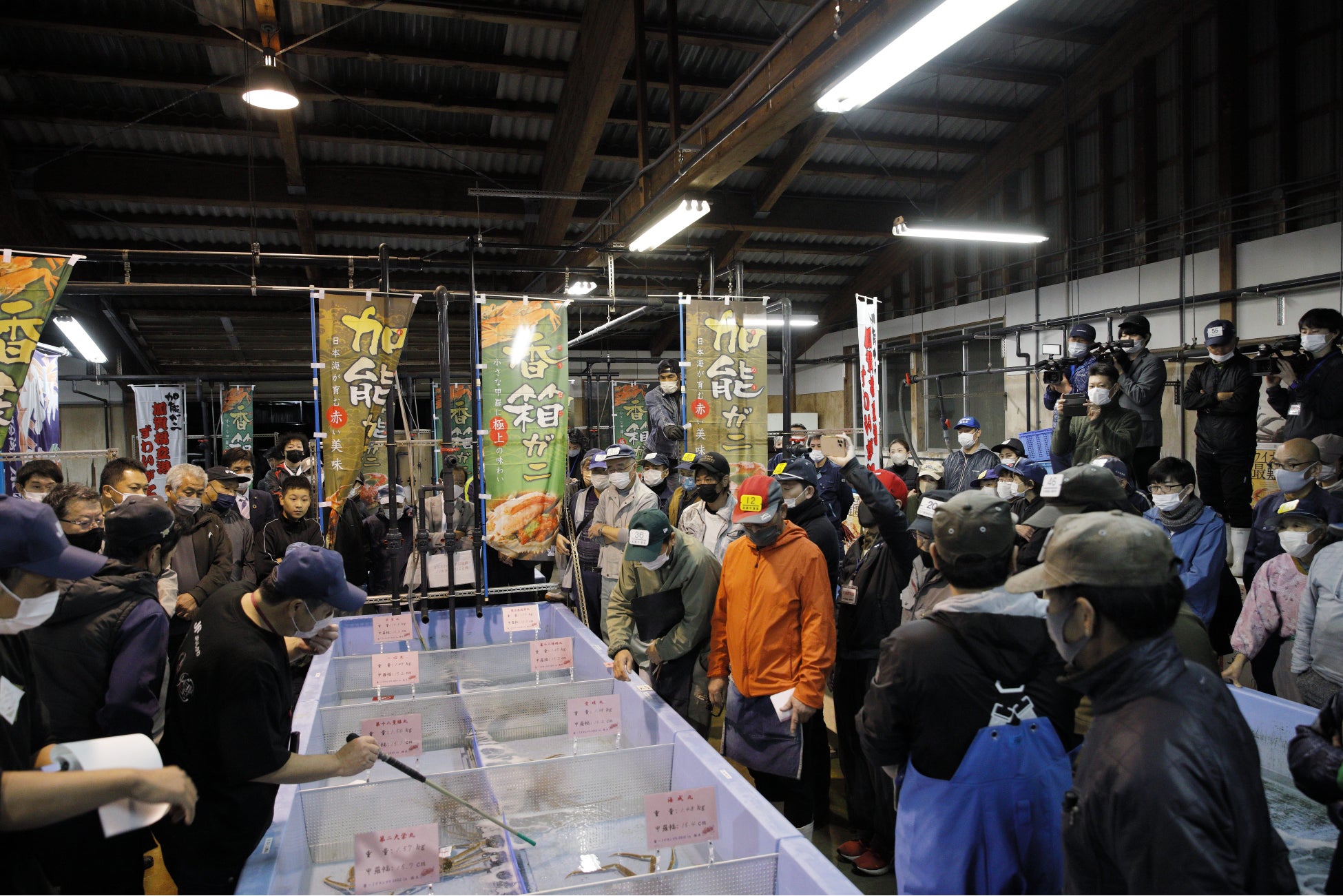 昨年の「蟹-1(カニワン)グランプリ」時に、史上最高額の500万円の値がつき話題となった加能ガニの最高級ブランド「輝」の他、今年9月に新たに発表した雌のズワイガニ(香箱ガニ)の最高級ブランド「輝姫」の初セリを実施。 「輝」は石川県漁協加賀支所にて1尾認定され、 「輝姫」は石川県漁協かなざわ総合市場、加賀支所にて計20尾認定され華々しい初セリデビューとなりました。今年は「輝姫」「輝」の2大ブランドガニが現れました。当日は昨年話題となったこともあり、多くのメディアも両市場に訪れ、初セリに注目していました。